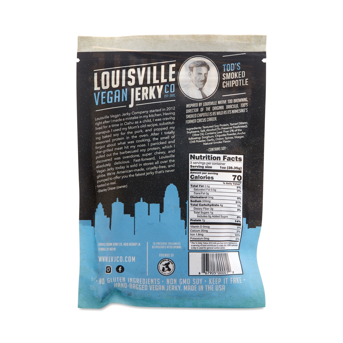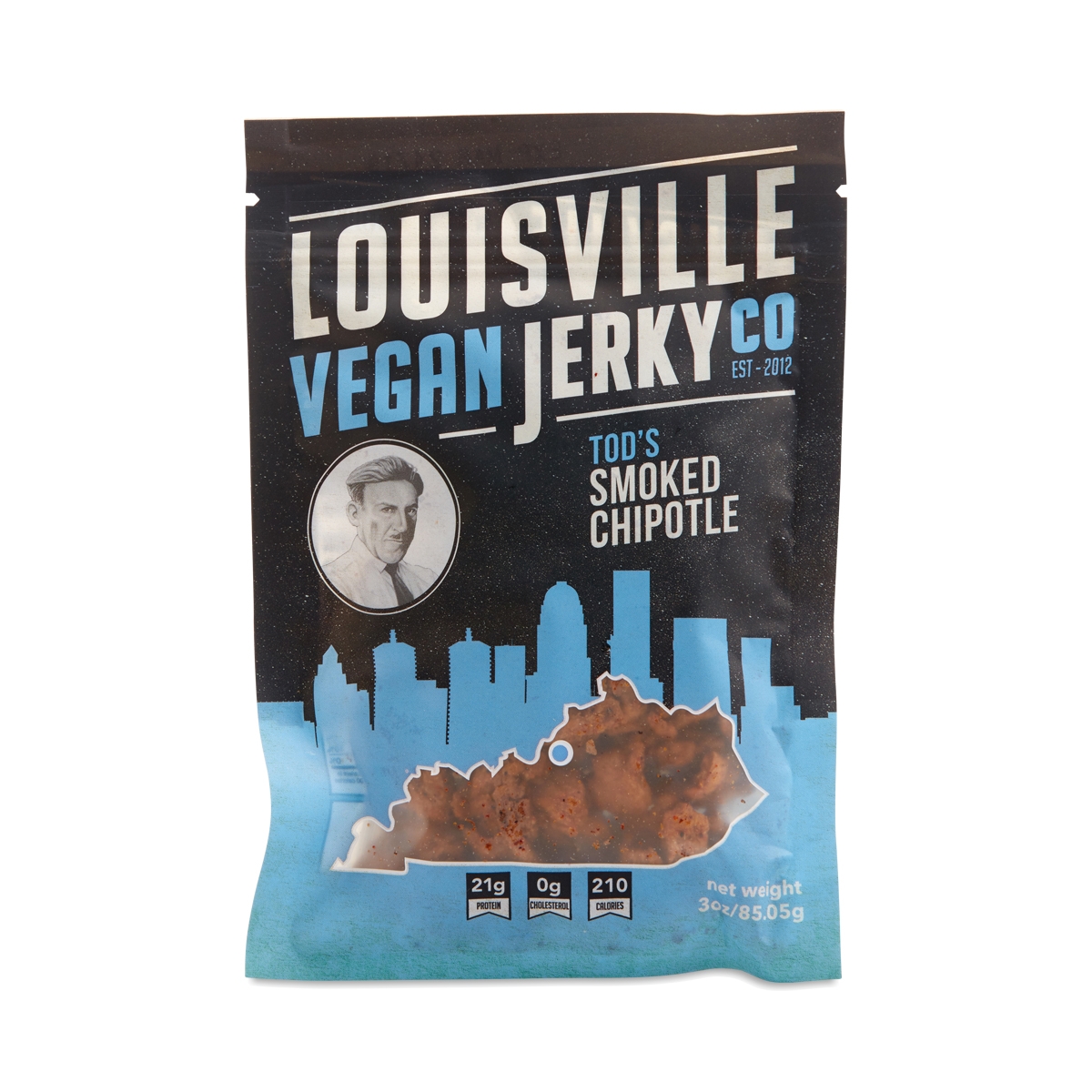 Todd’s bourbon smoked chipotle flavor is deliciously spicy and picked by Women’s Health Magazine as their favorite vegan jerky. We spice it up with ancho and chipotle powder and subtly sweeten it with Kentucky proud sorghum (sourced from a farm 50 miles away). When you want a jerky with a bit of a kick go for this flavor. Ingredients Textured soy protein, tamari (water, soybeans, salt, alcohol [...