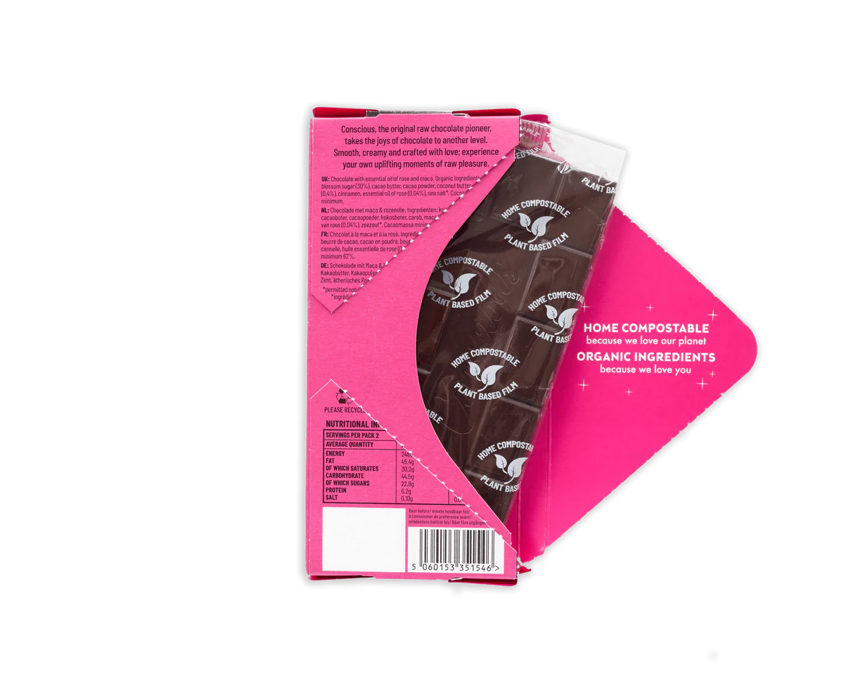 Chocolate made with essential oil of rose and maca. Organic ingredients: coconut blossom sugar (30%), cacao butter, cacao powder, coconut oil, carob, maca (0.4%), essential oil of rose (0.04%), cinnamon, sea salt*. Cacao solids 62% minimum. (*Allowable non-organic ingredient)