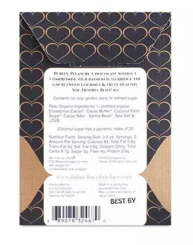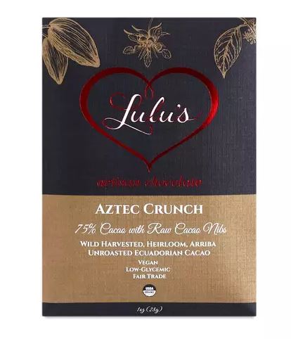 Inspired by ancient Aztec recipes, this sensually smooth dark chocolate cradles cacao nibs and coconut sugar to make Aztec Crunch deliciously irresistible! Ingredients Organic & Fair Trade Ingredients: *= certified organic: Ecuadorian Cacao*, Cacao Butter*, Coconut Palm Sugar*, Cacao Nibs*, Sea Salt, Vanilla Bean*, & LOVE.
