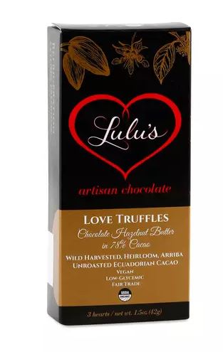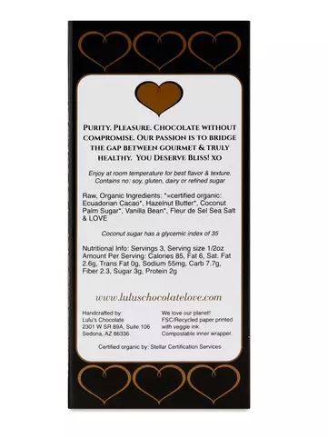 78% cacao hearts cradle a rich, chocolate hazelnut filled center. These seductively creamy, hand-poured hearts are lovingly sprinkled with Fleur de Sel sea salt. They are sure to win your sweet heart. Ingredients Organic & Fair Trade Ingredients: *Ecuadorian Cacao, *Sprouted Hazelnuts, *Coconut Palm Sugar, *Vanilla Bean, Fleur de Sel Sea Salt & LOVE.