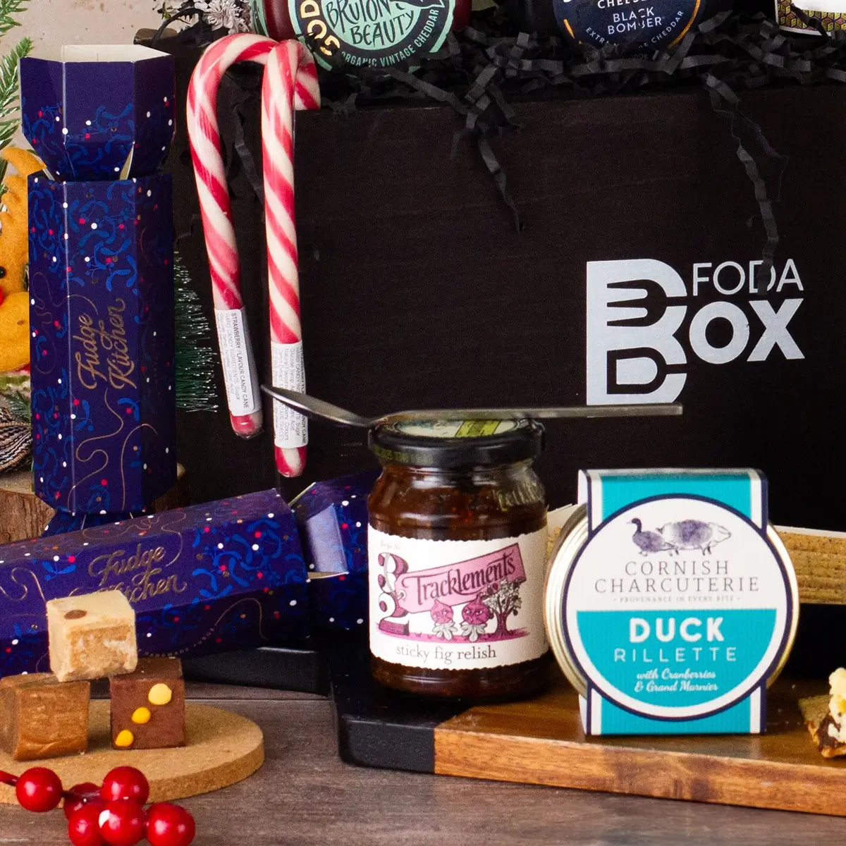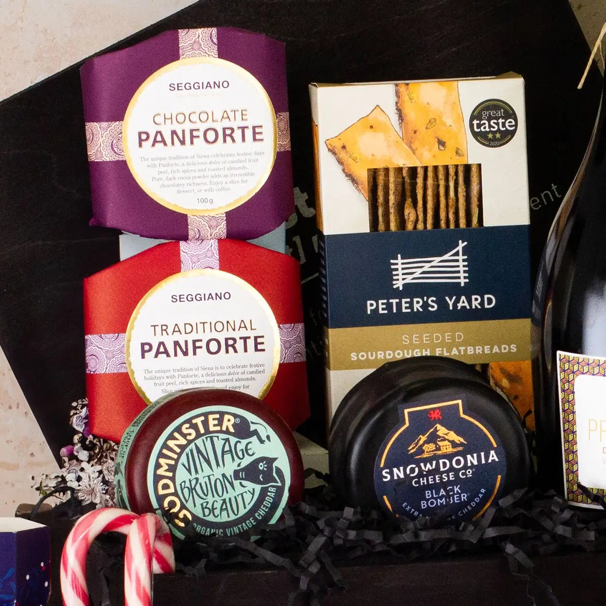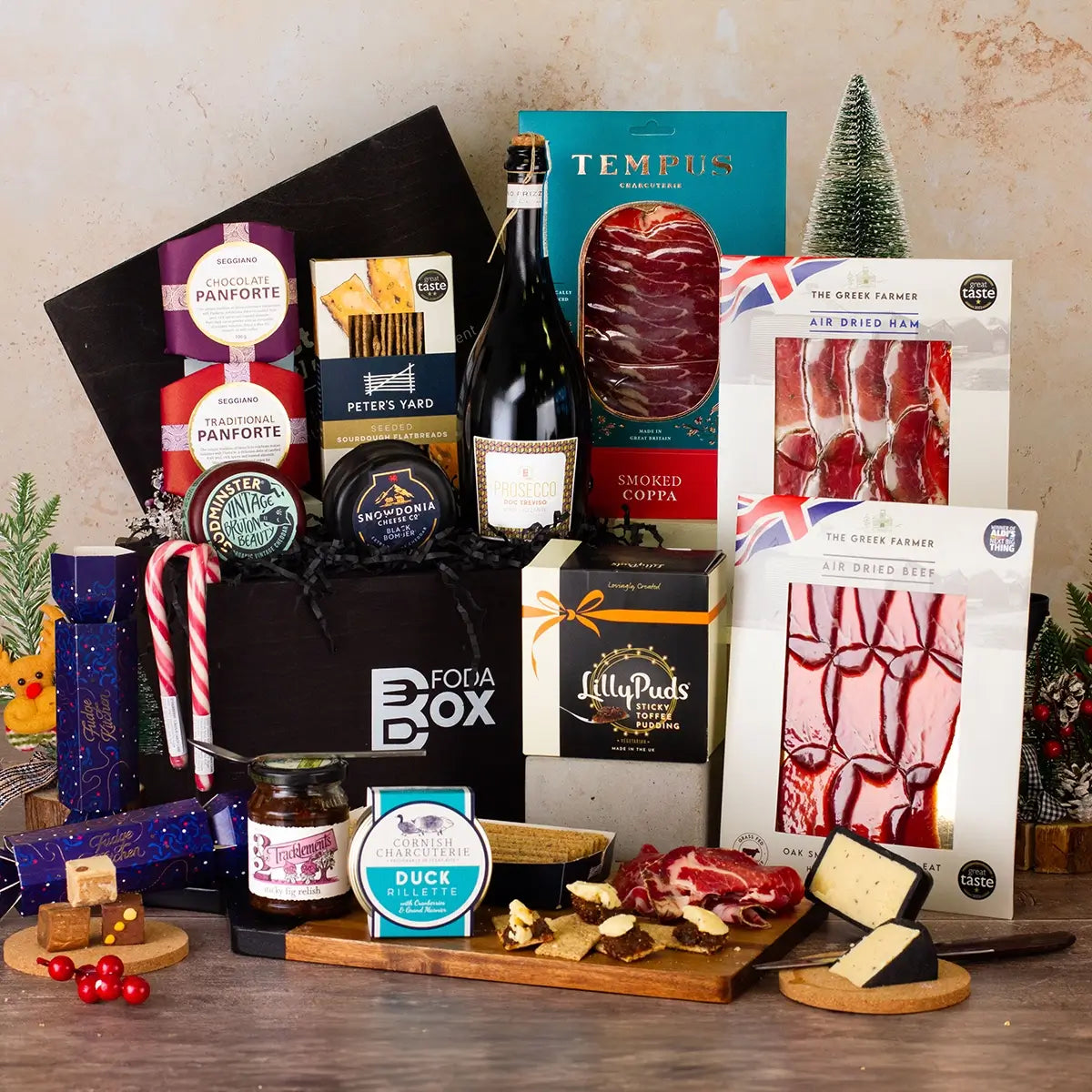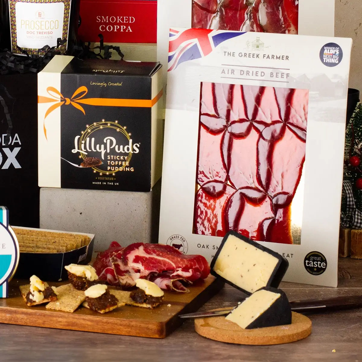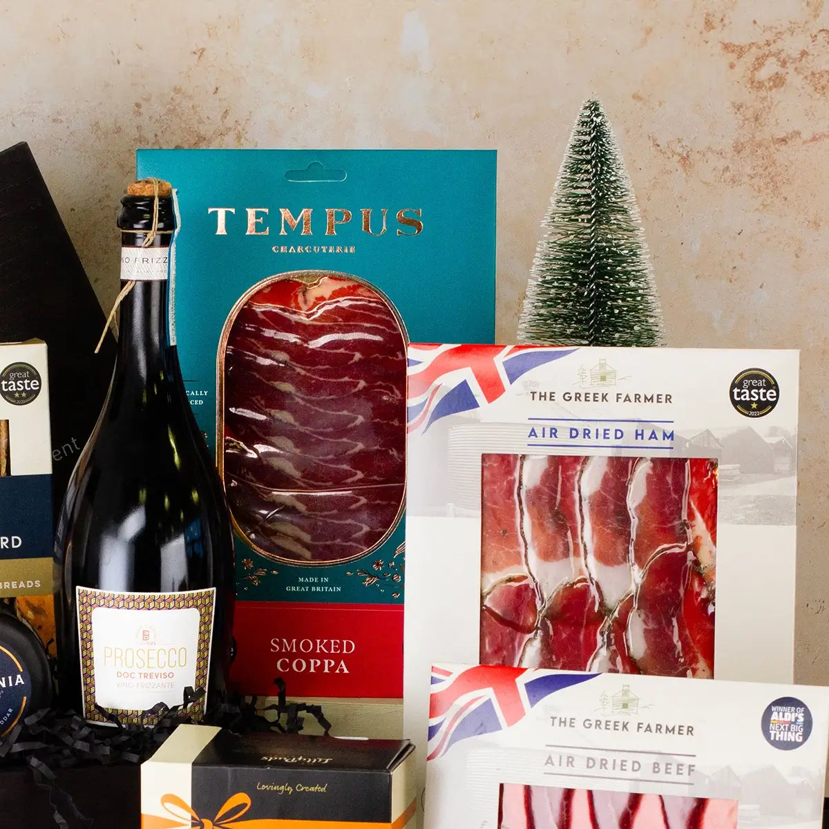 Indulge in a festive celebration of British gourmet delights with our luxury Christmas hamper, offering a truly artisanal and handpicked selection to enhance your holiday festivities. This luxury Christmas hamper exudes elegance with its thoughtfully curated assortment of award-winning treats that encapsulate the magic of Christmas. Every item is meticulously chosen to ensure a premium experience for those in search of luxury Christmas gift hampers, luxury Christmas meat hampers, and luxury hampers for Christmas alike. Envisage gathering with loved ones and savouring the rich flavours of artisan cheese from Godminster and Fine Cheese, perfectly complemented by succulent slices of air-dried beef, ham and Coppa from The Great Farmer and Tempus. The vibrant medley of tastes is further elevated by the satisfying crunch of sourdough flatbread and a delectable, tangy relish that enhances the savoury depth of the charcuterie, whilst a glass of refreshing Prosecco adds a celebratory sparkle to the feast.
