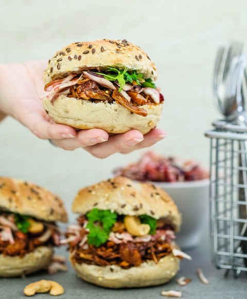 8. Place generous portions of slaw on the bottom buns, top with generous serving of BBQ jackfruit, and cashews. Serve with extra BBQ sauce!