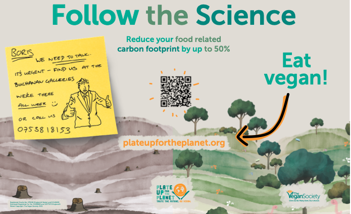The advert features a yellow post-it note for Boris – telling him that he needs to urgently talk to The Vegan Society. It suggests he comes to Glasgow’s Buchanan Galleries where The Vegan Society will be throughout COP26 encouraging people to try a vegan diet for a week and providing vegan recipes and delicious vegan treats.