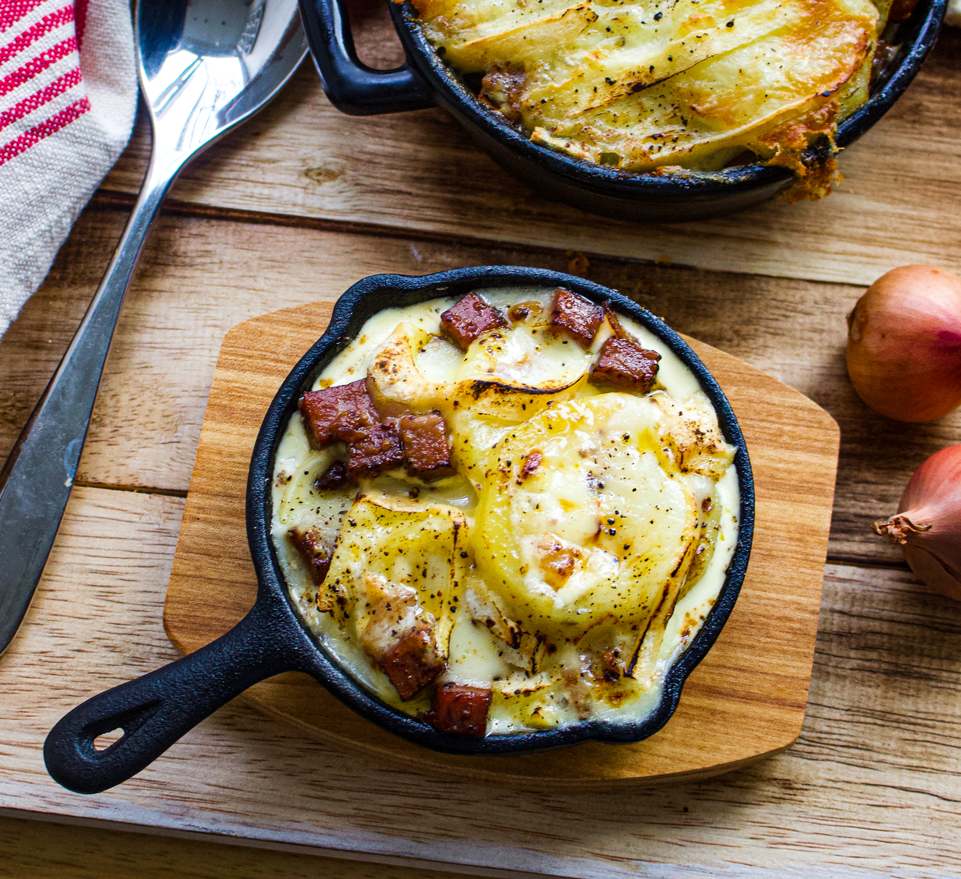 This French-style cheesy potato bake will be one of your family favourite dishes in winter. It contains super tasty vegan bacon lardons, and you won’t believe it’s made entirely with plants!