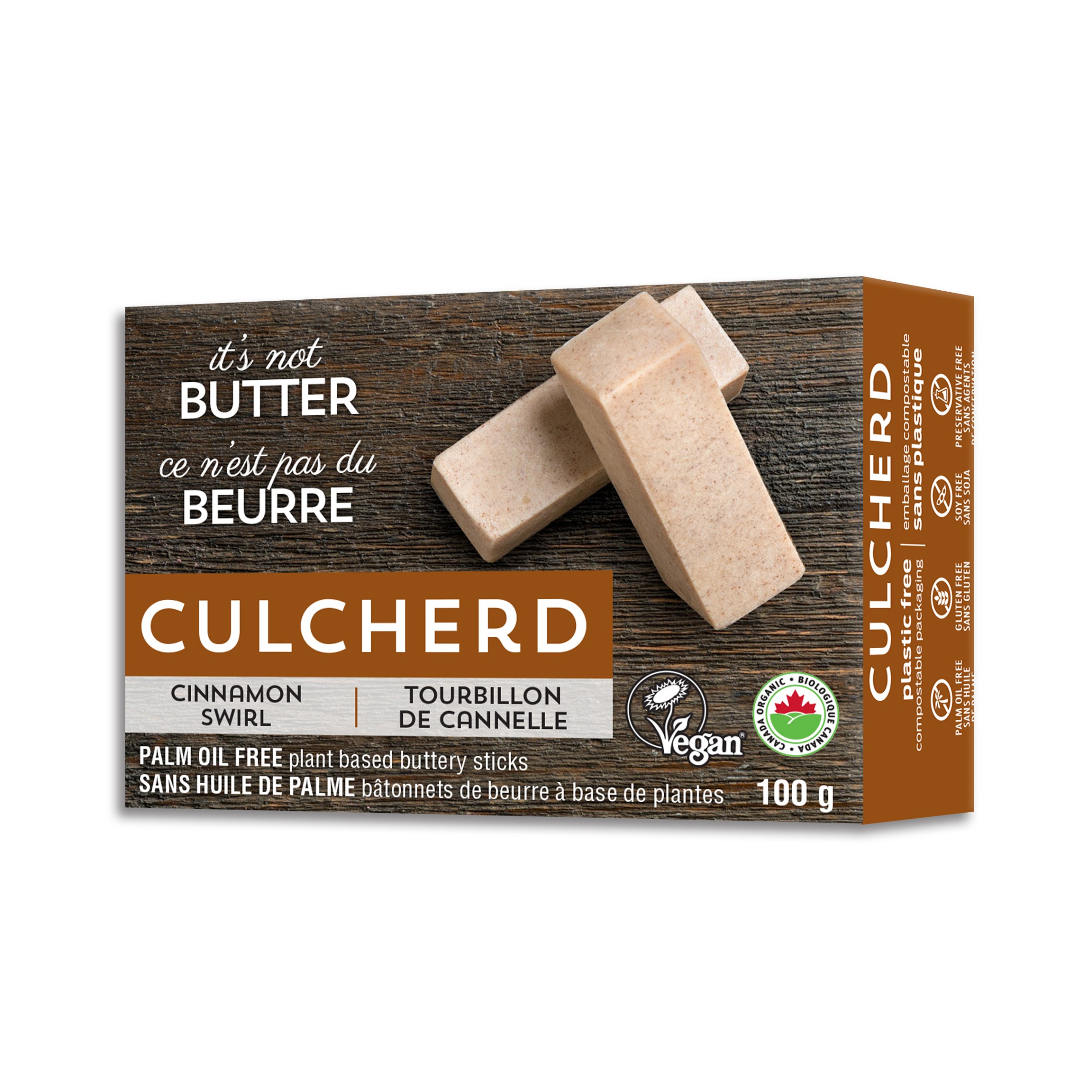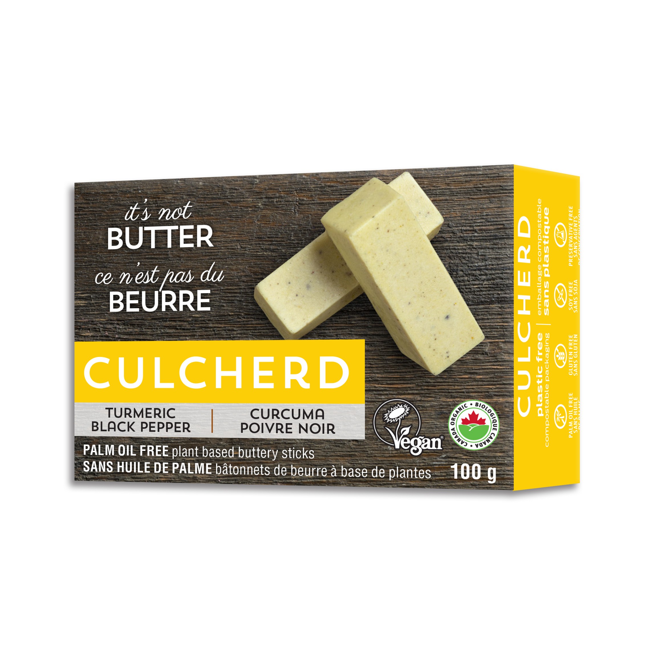 Culcherd has recently added “It’s Not Butter” to their product line, which melts just like dairy butter and can be used as a 1:1 replacement. It is cultured, organic, palm-free, soy-free and is sold in stick form, not in a plastic tub. The 4 butter flavour offerings include Original, Garlic, Turmeric Black Pepper, and Cinnamon Swirl.