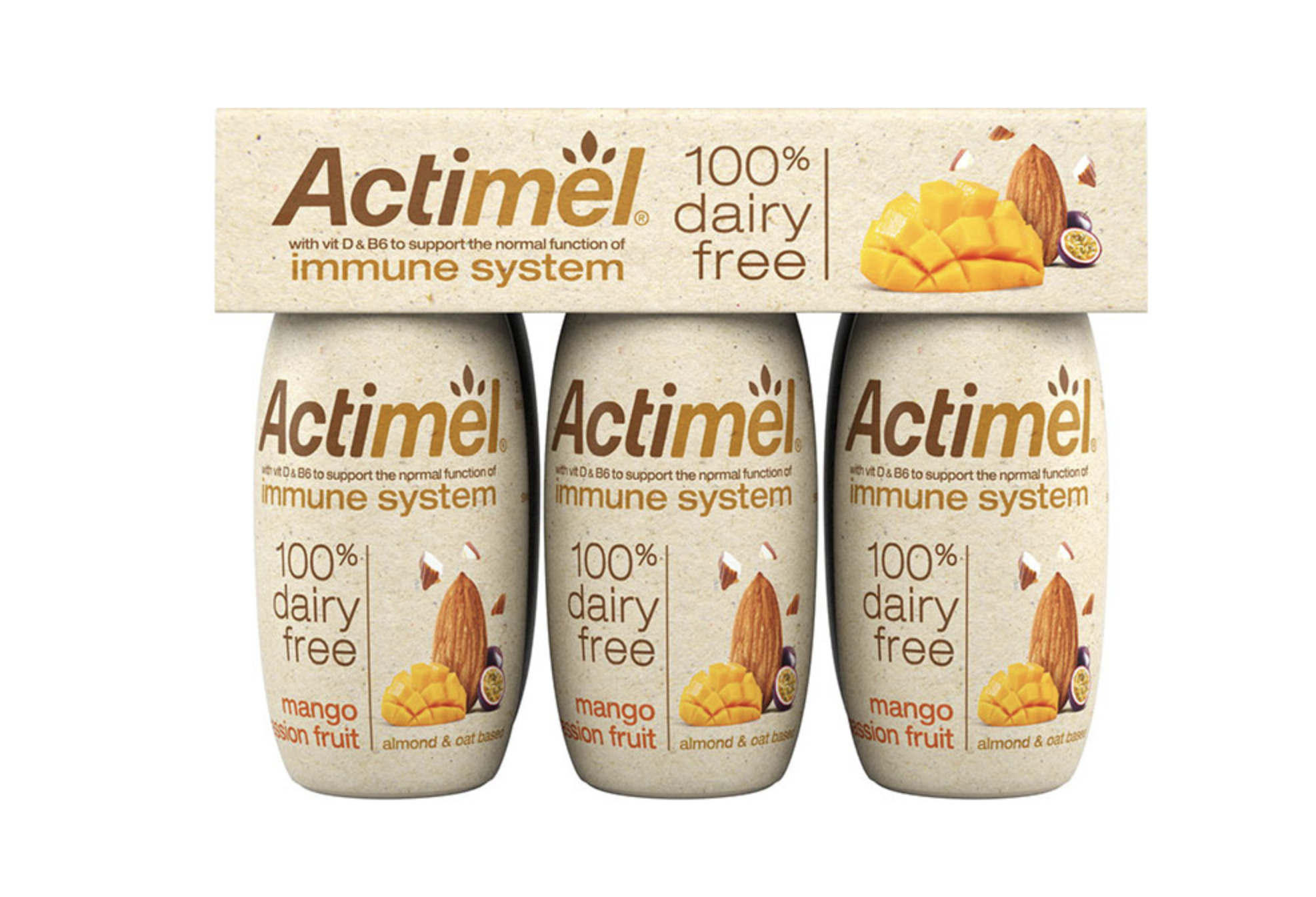 Actimel 100% Dairy Free is made using a blend of roasted almonds and oats along with living cultures, including AL. Casei, and essential vitamins B6 and D.