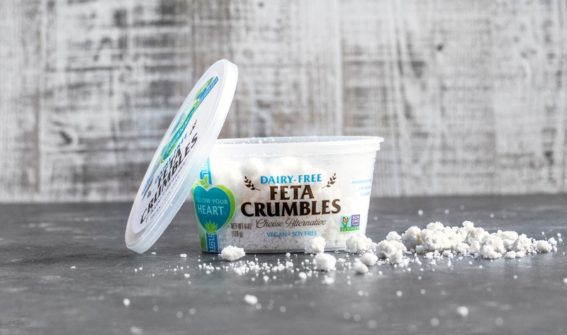 Dairy-Free Feta Crumbles Cheese Alternative is made with organic coconut oil, filtered water, potato starch, potato protein (less than 2%) and sea salt.