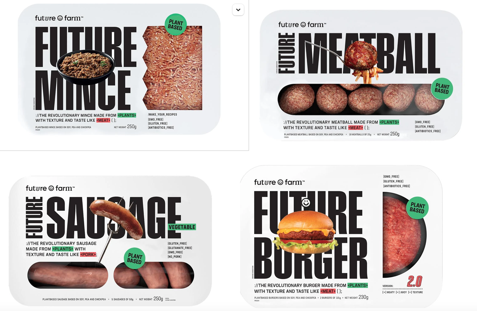 The Future Farm range includes burgers, mince, meatballs and sausages all made from 100% natural ingredients. The products are GMO & gluten free. Future Meatballs, Future Burgers, Future Sausages and Future Mince are made using a blend of soy, pea and chickpea proteins.