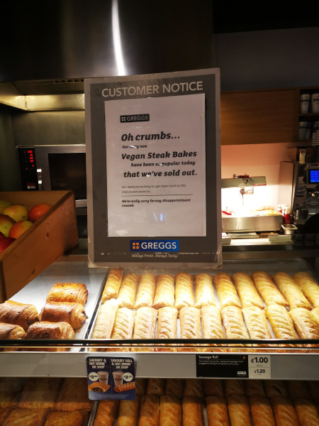 The product was sold out in at least one location in the city centre of Glasgow. A picture from one Greggs store located on Gordon Street showed a sign telling customers that the vegan bake had already sold out.