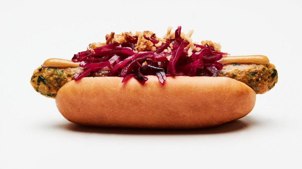 The plant-based hot dog is made from red lentils, kale, carrots, and ginger. It comes topped with fried onions, pickled cabbage and mustard.