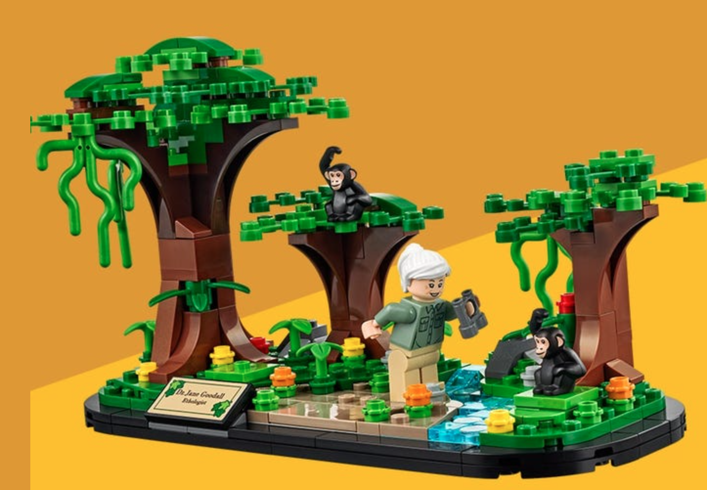 The special Lego set features a mini figure of Goodall along with three figures chimpanzees all set in a jungle scenery with trees, flowers, and even a river.