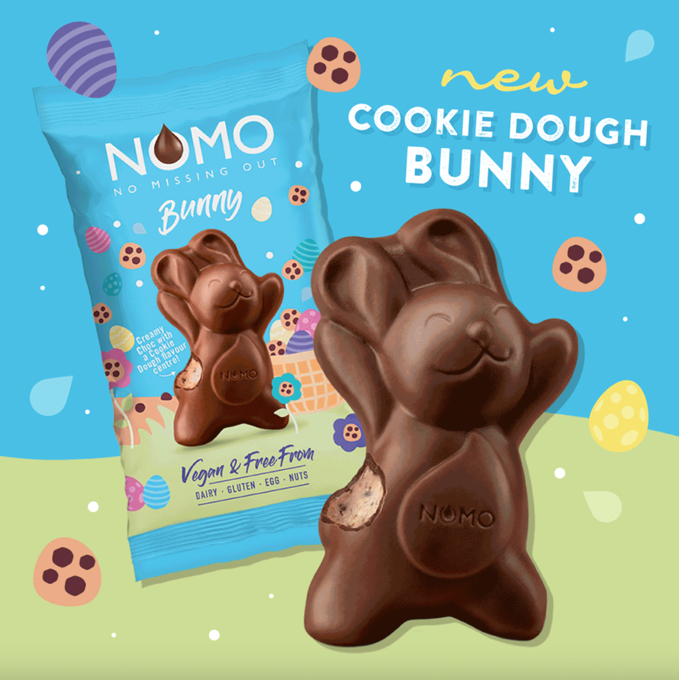 The brand-new Cookie Dough Bunny and Egg take centre stage of NOMO’s Easter dairy free chocolate line up.