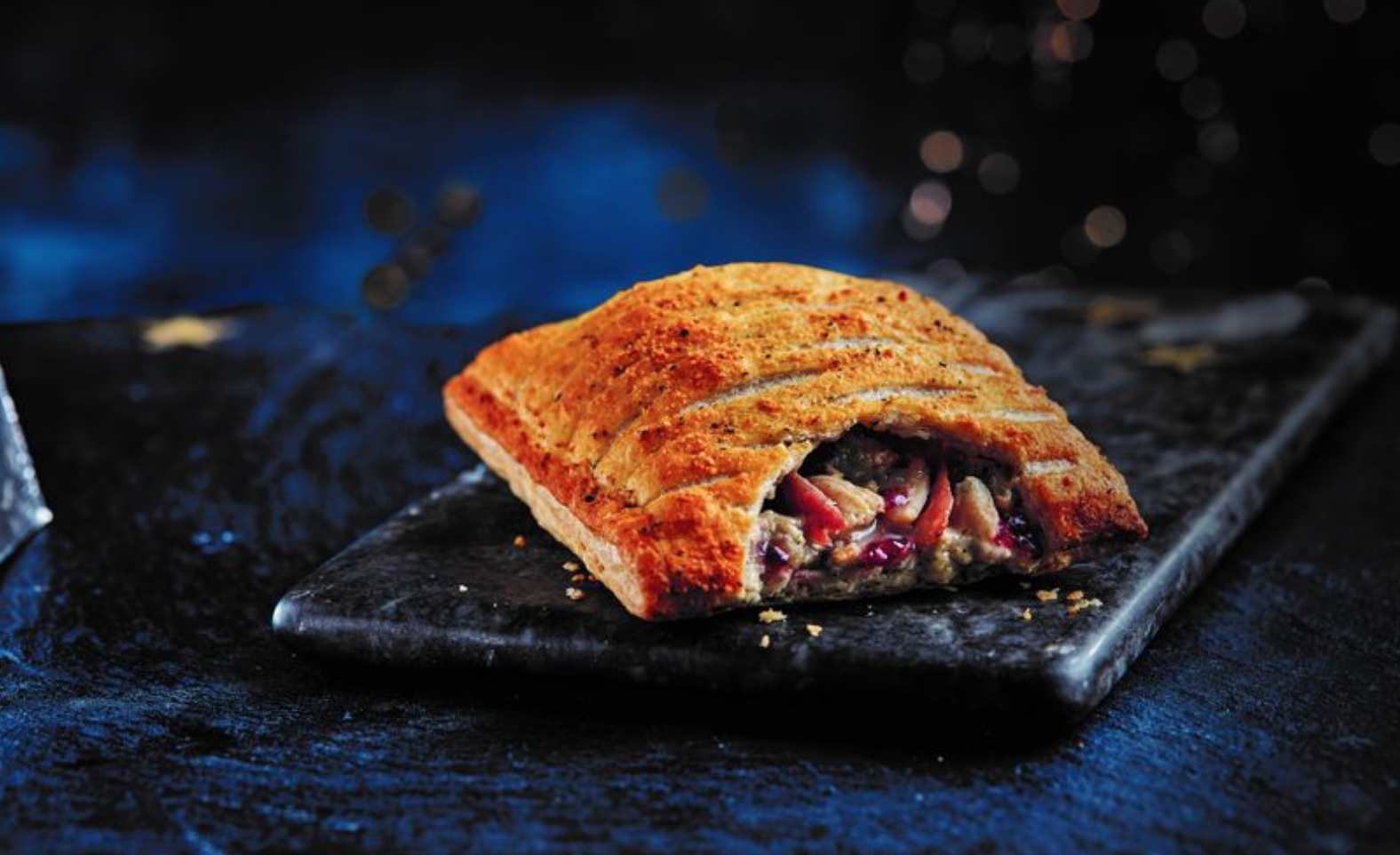 The vegan version of Festive Bake is made with Quorn's plant-based mycoprotein pieces, sage & onion stuffing, vegan bacon crumb with a mouth-watering sage & cranberry sauce, all encased in a puff pastry.