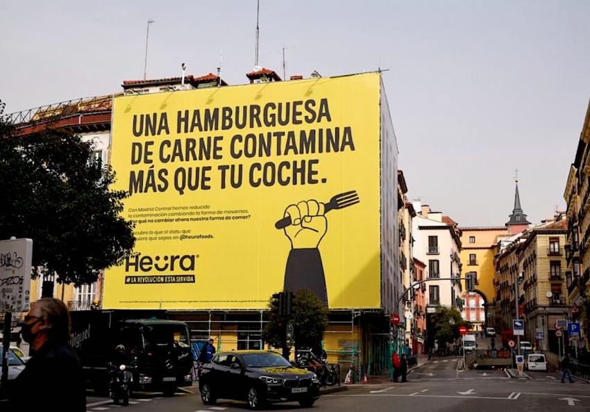 The landmark case will see meat associations Provacuno and Interporc VS Heura face each other in court after Heura decided to remove their advertising billboard in central Madrid last December. The campaign highlighted the enormous pollution caused by the meat industry and animal farming and was titled 'One beef burger pollutes more than your car.'