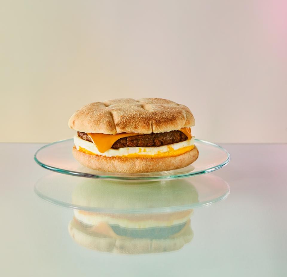 The sandwich features a plant-based patty from Beyond Meat, topped with cheddar cheese and egg on an artisanal bun.