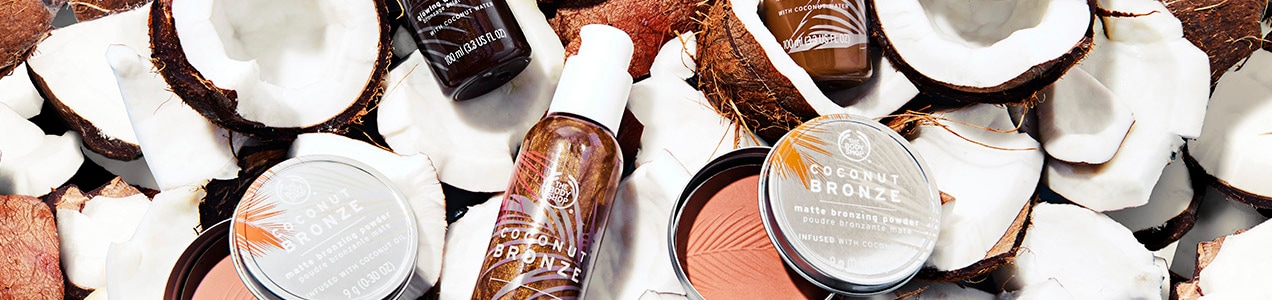 The Coconut Bronze range includes a Coconut Bronze Shimmering Dry Oil, Gradual Tan Lotion, Glowing Wash-Off Tan, Glow Powder and Matte Bronzing Powder.