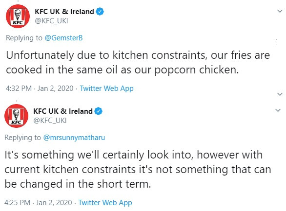 The chain said: "Unfortunately due to kitchen constraints, our fries are cooked in the same oil as our popcorn chicken."