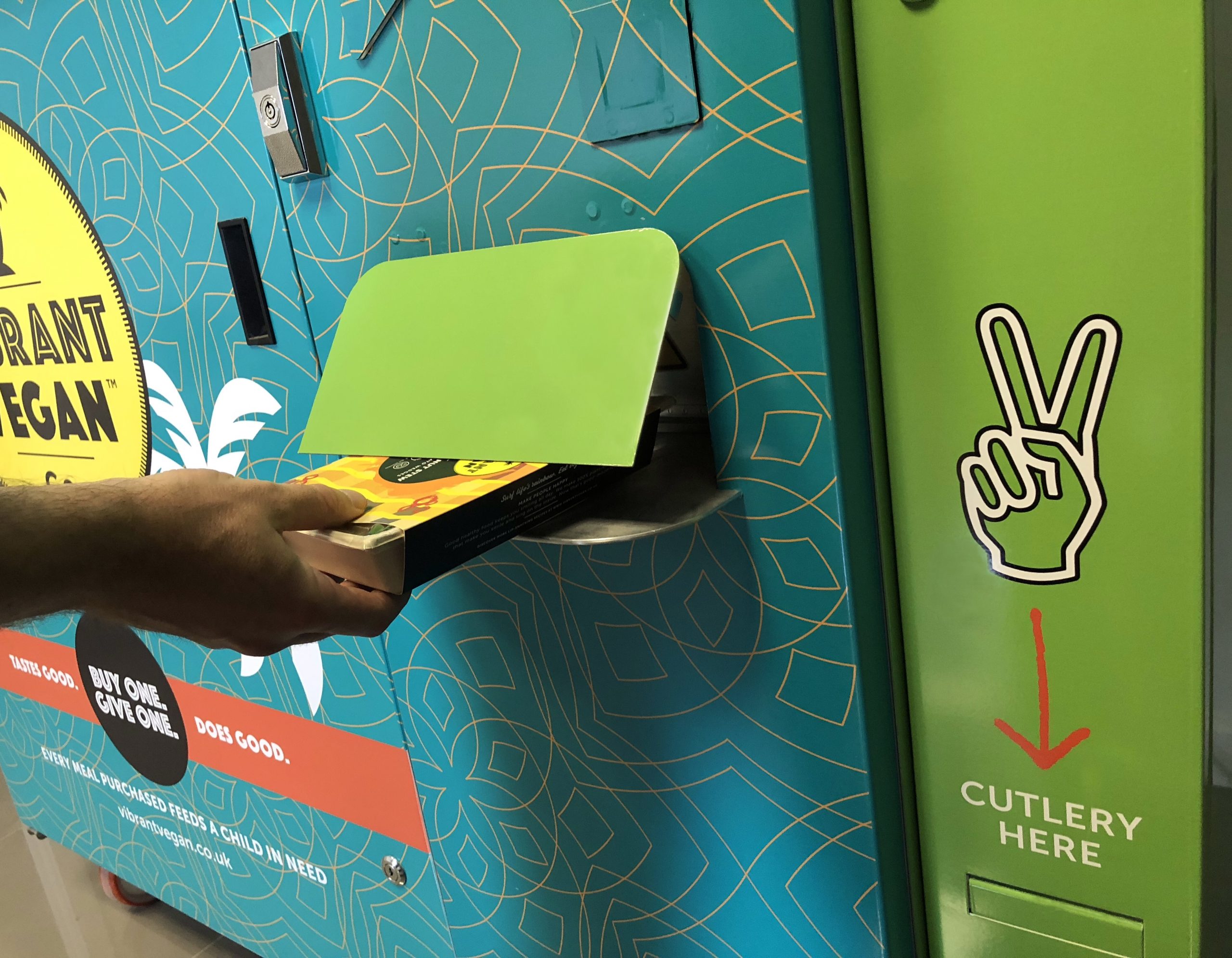 The hot meals vending machine was installed in a collaboration between vegan ready meals brand Vibrant Vegan and vending machine seller Open Kitchen Co.