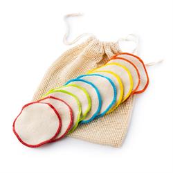 10 organic make up remover wipes with an organic cotton wash bag. GOTS certified A perfect set for removing your makeup but can be used for other daily wipes. Ideal for replacing disposable cotton wool. 10 round washable wipes with coloured trims. 100% organic cotton complete with an organic wash bag to keep them in order in your washing machine. Washable up to 60' Wipes Size: 9cm diameter Wa...