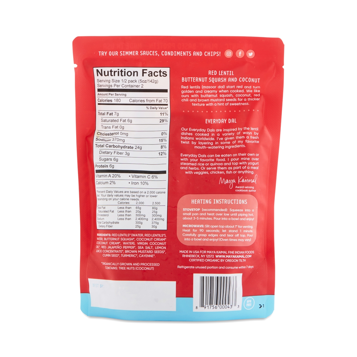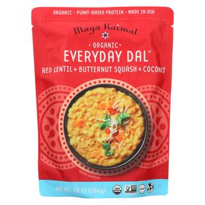 Red lentils (masoor dal) start red and turn golden and creamy when cooked. This Everyday Dal is made with butternut squash, coconut, red chili and brown mustard seeds for a thicker texture with a hint of sweetness! Ingredients: Red Lentils* (Water, Red Lentils*), Water, Butternut Squash*, Coconut Cream* (Coconut Cream*, Water), Virgin Coconut Oil*, Red Jalapeno Pepper*, Sea Salt, Lemon Juice Conc...