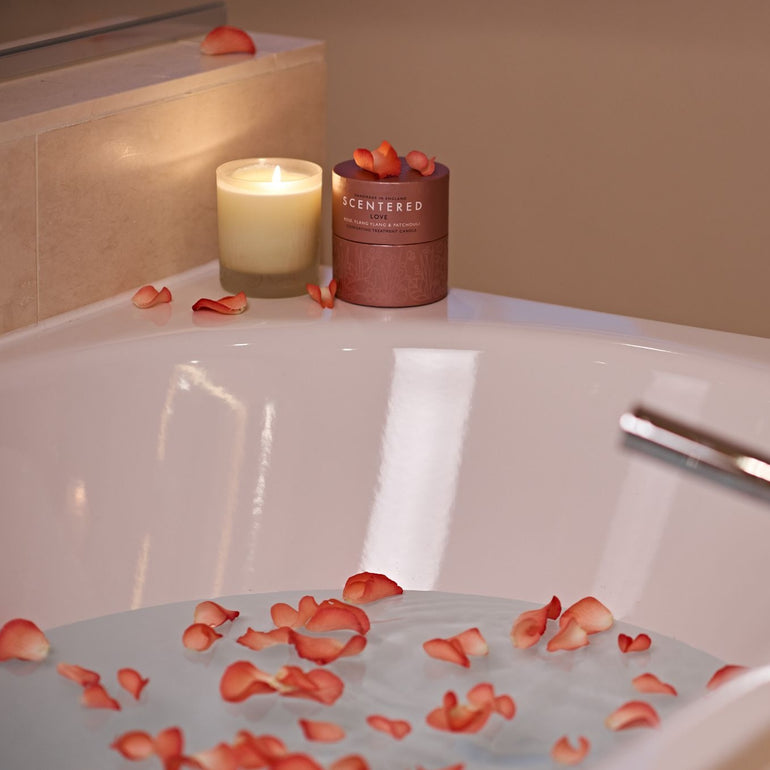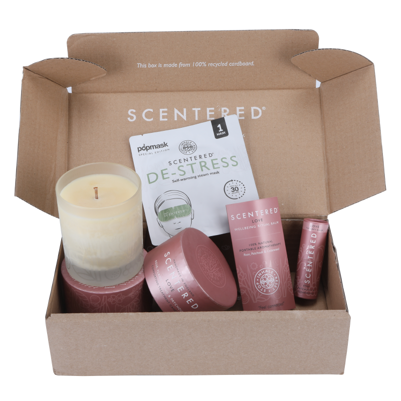 Our warm and comforting Love blend was created to help you rebalance and reconnect emotionally. The scent profile fuses rose for balance, calming patchouli and cedarwood to keep you grounded. Each gift set contains an aromatherapy candle, soothing balm and destressing eye mask.