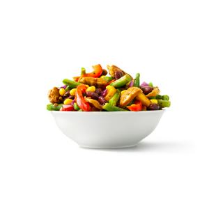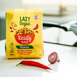 Mexican-style meal full of vegetables, pea protein-based chicken style pieces and Mexican seasoning. Free from soy & gluten. 350g
