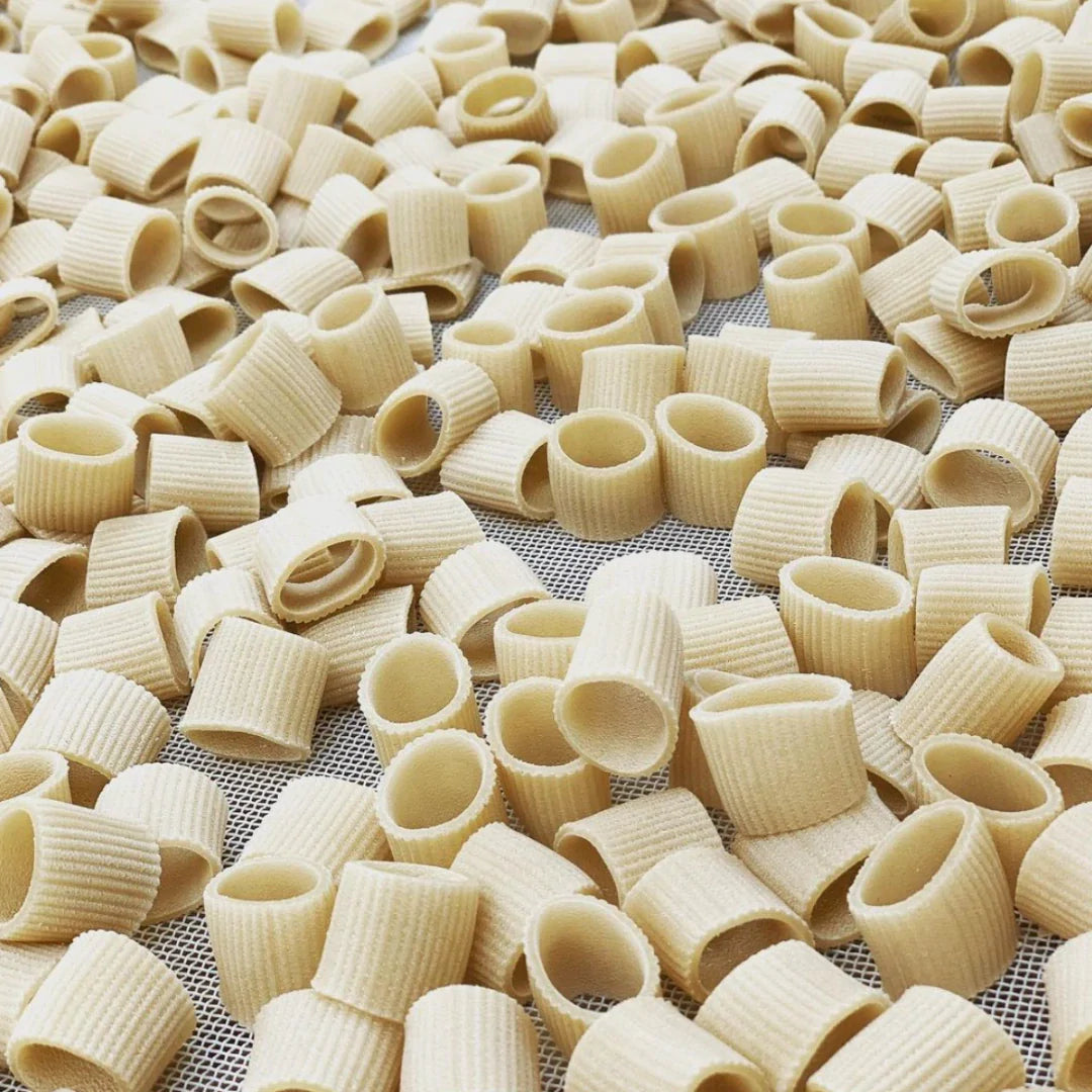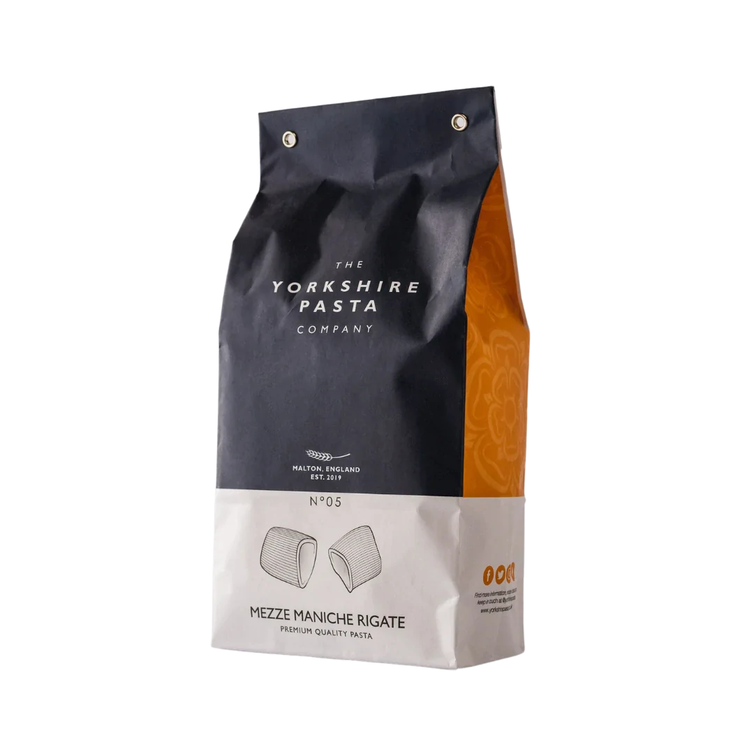 Ridged tubes of pasta almost as wide as they are long, with furrows down the outside. Rumoured to be hard to find and unlikely to be appreciated outside of Rome, this stylish number is making its debut in Yorkshire. They are capable of holding a range of sauces, from substantial and meaty to creamy and velvety. Naturally dried pasta means these keep well without stabilisers or preservatives.