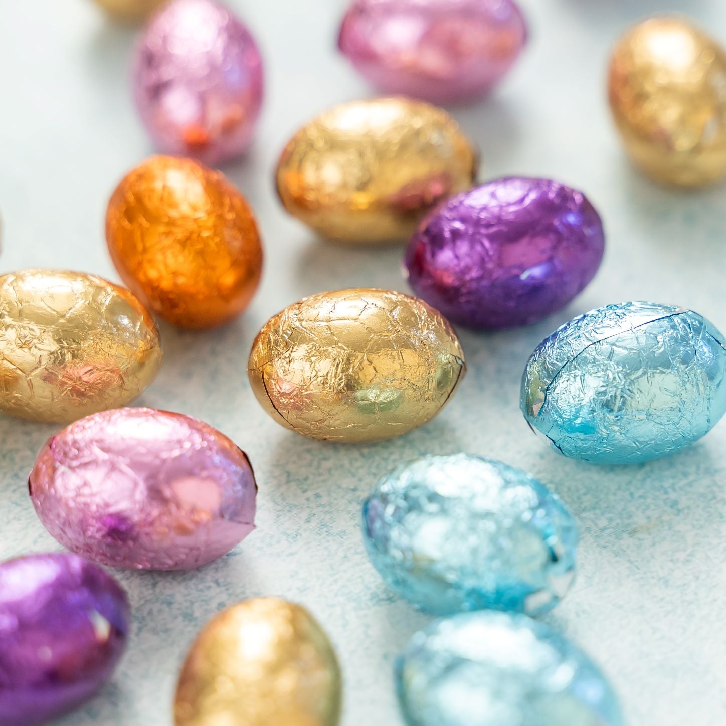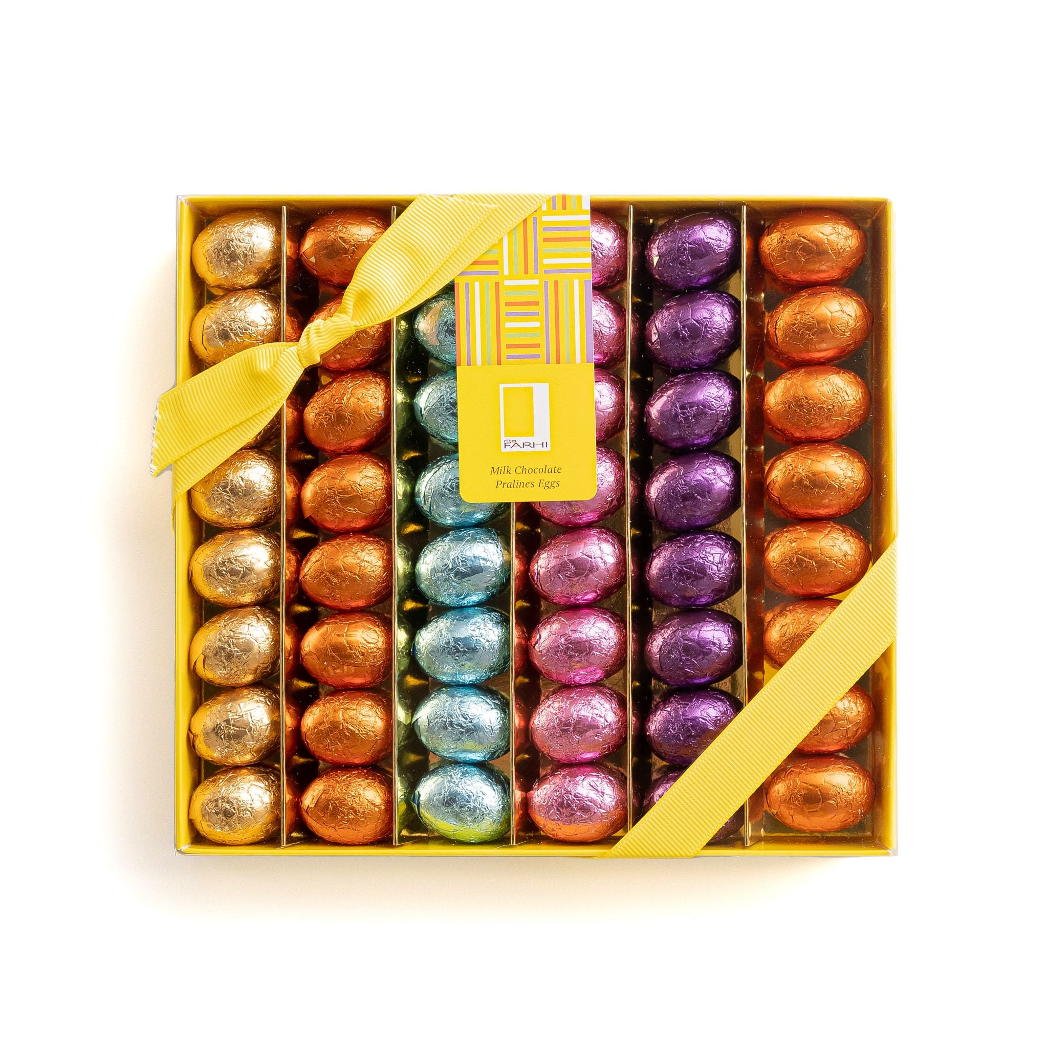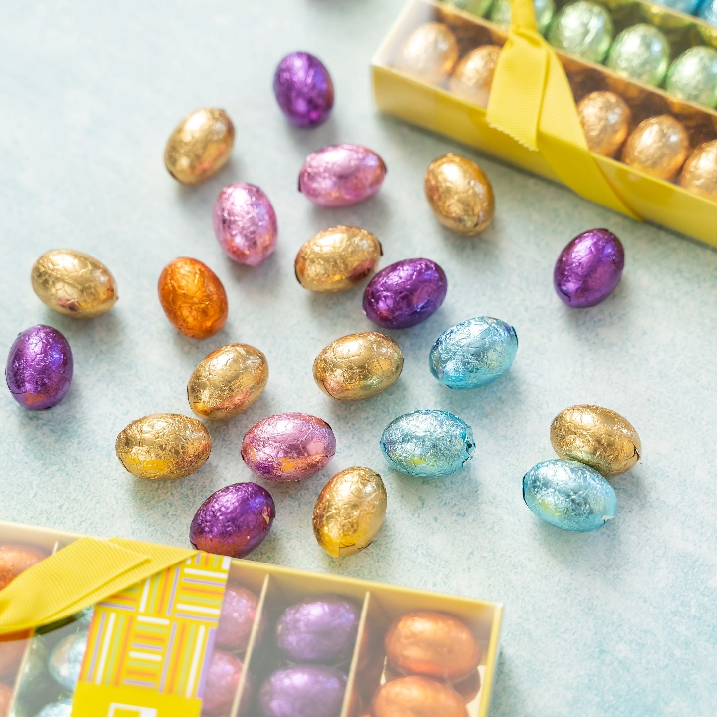 A delicious assortment of chocolate pralines. Each one of our milk chocolate praline mini eggs is wrapped in attractive, jewel coloured foiling. Presented in a luxury gift box, this makes for a wonderful gift for chocolate lovers. Perfect for Easter.