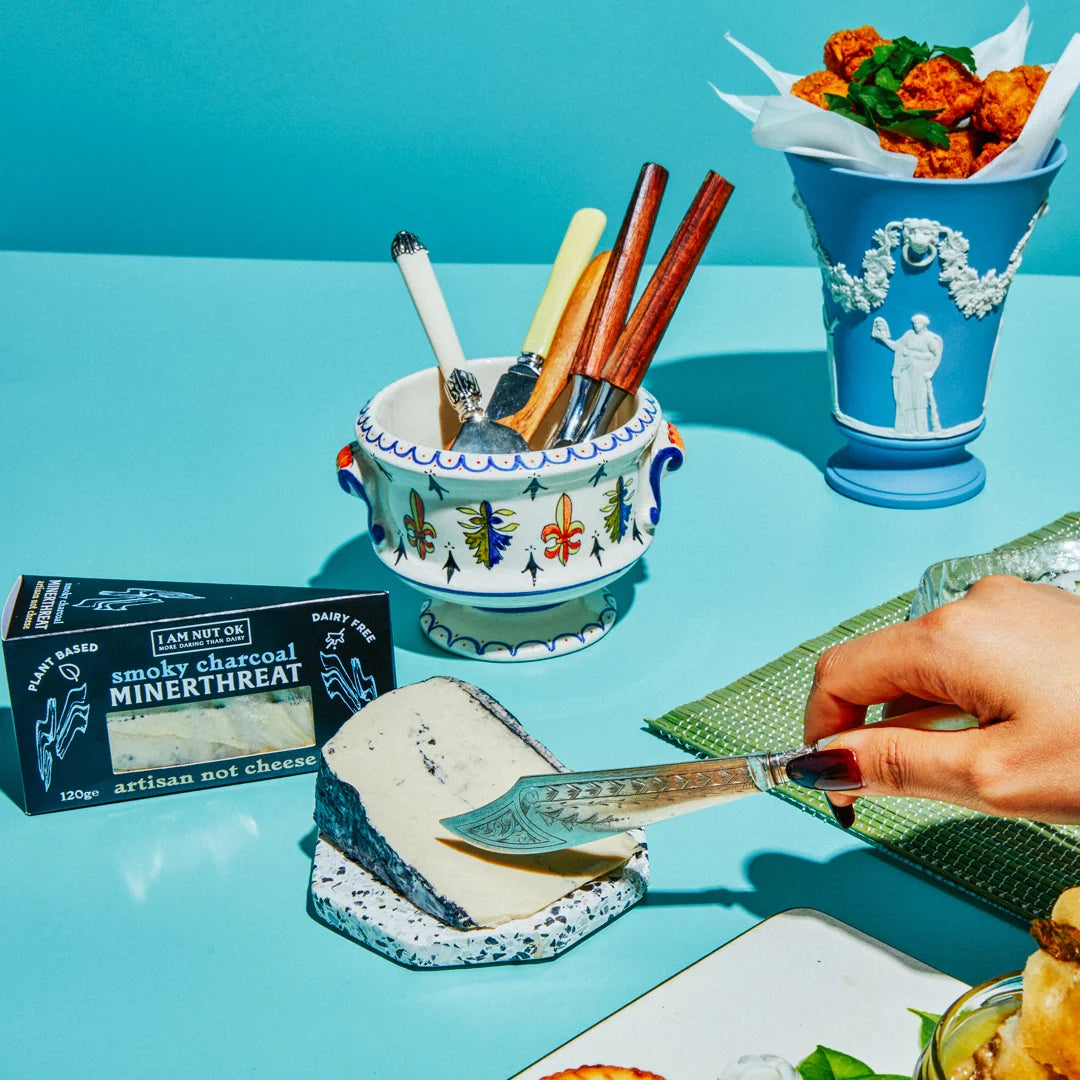 A bold, smoky cashew cheese ripened in a coat of activated coconut charcoal ash also features a gorgeous black vein running down the centre. A depth of woody, hickory flavours give body to the cashew nut’s natural creaminess.