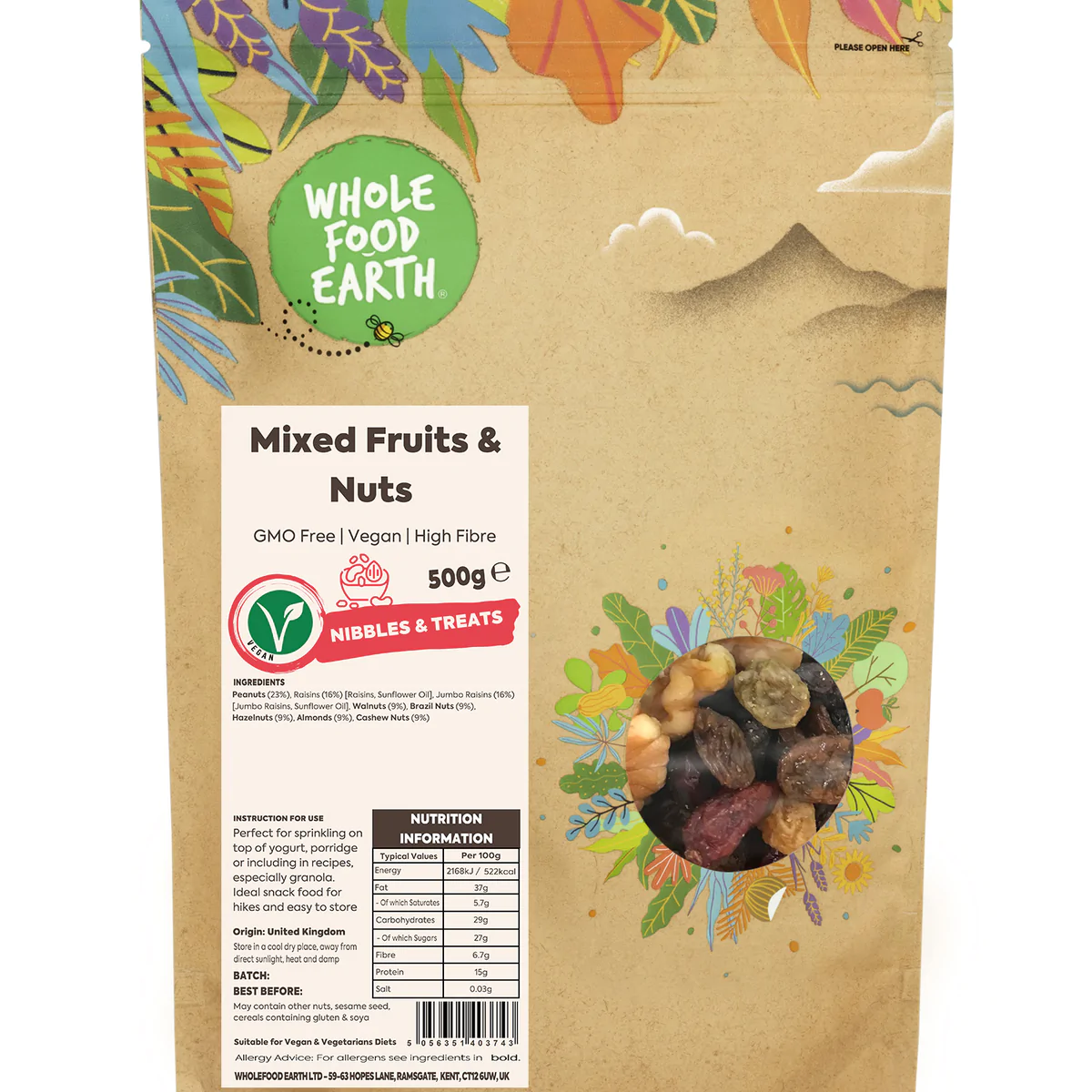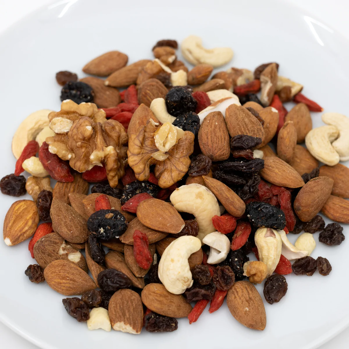 This sweet snack mix combines Peanuts, Raisins, Cashew nuts, Brazil nuts, Walnuts, Almonds and Hazelnuts.