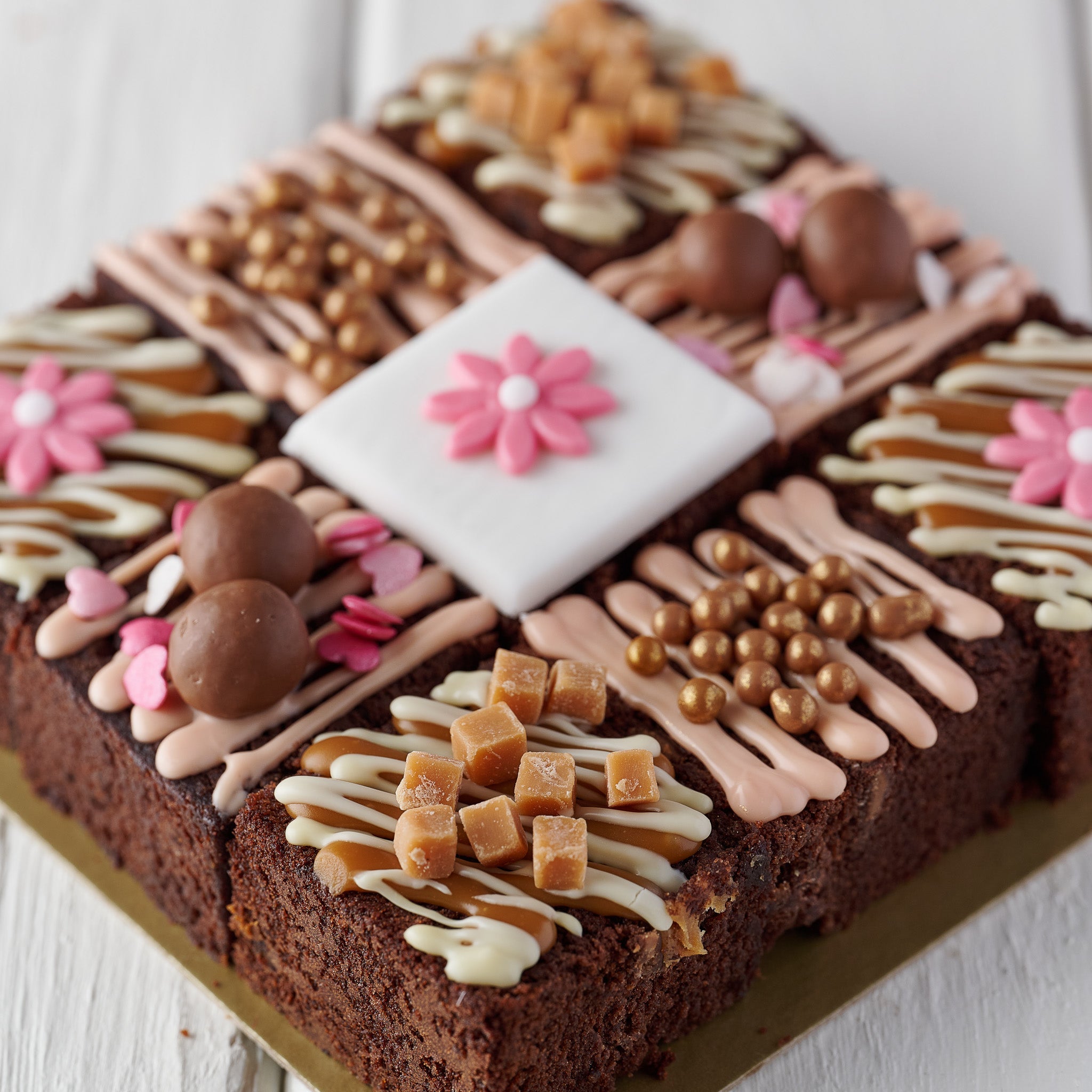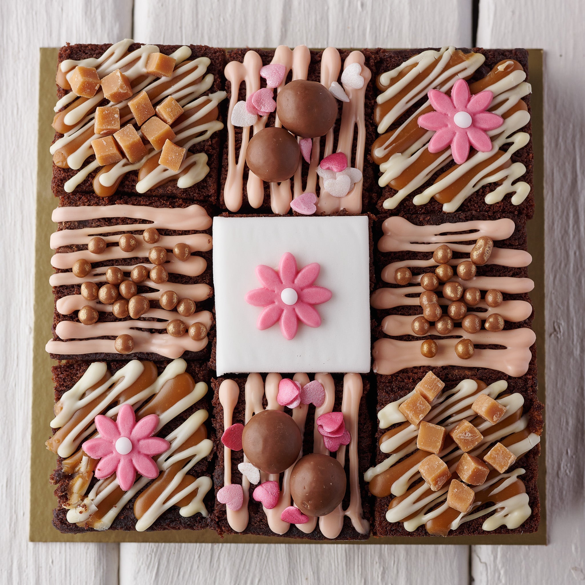 Inside, you’ll find 9 individual squares of rich chocolate truffle cake—a delightful fusion of a chocolate cake and a gooey brownie. Each square is topped with smooth Belgian chocolate, chunks of fudge, crunchy malt balls, and finished with sugar flowers and hearts.