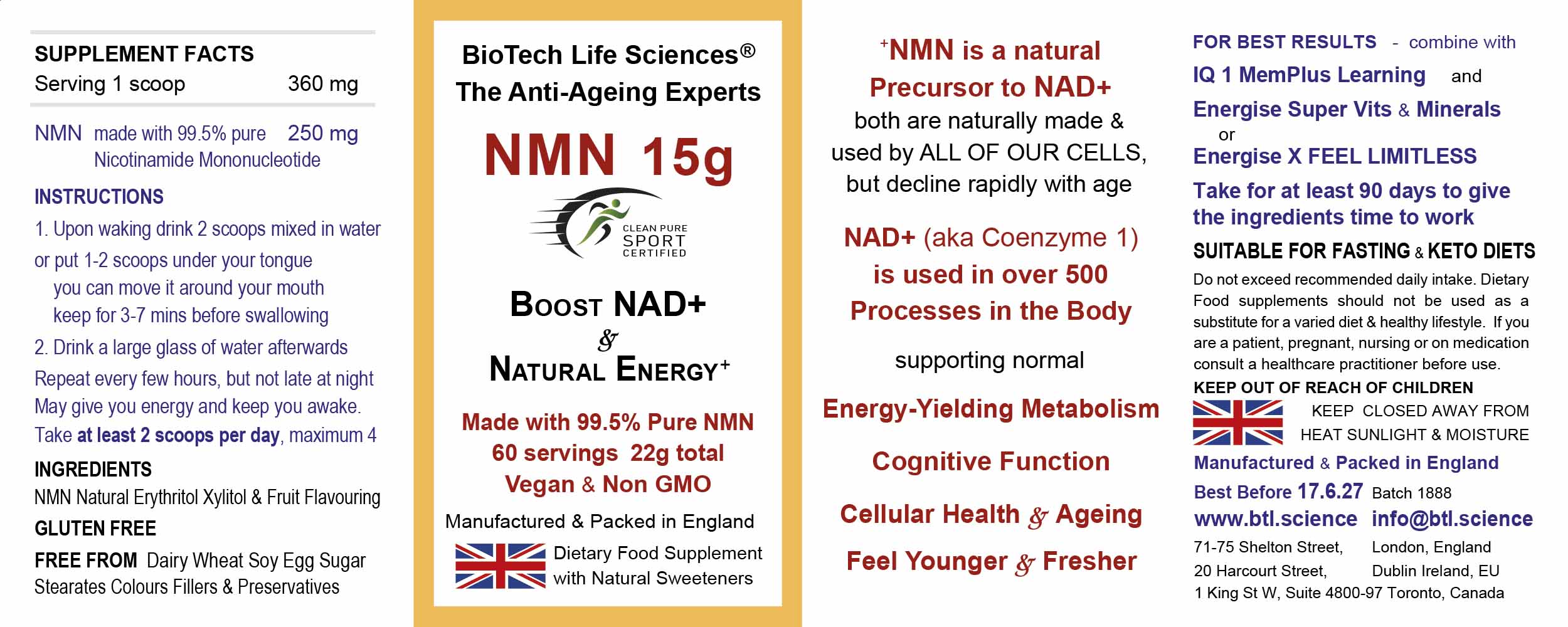 NMN 15 grams Ultra Pure >99.5% + Cold Pressed Nicotinamide Mononucleotide + natural citrus flavouring Anti-Ageing NAD+ Precursor Increases Energy-Yielding Metabolism Increase NAD+ levels Cold Processed Nicotinamide Mononucleotide + natural citrus flavouring