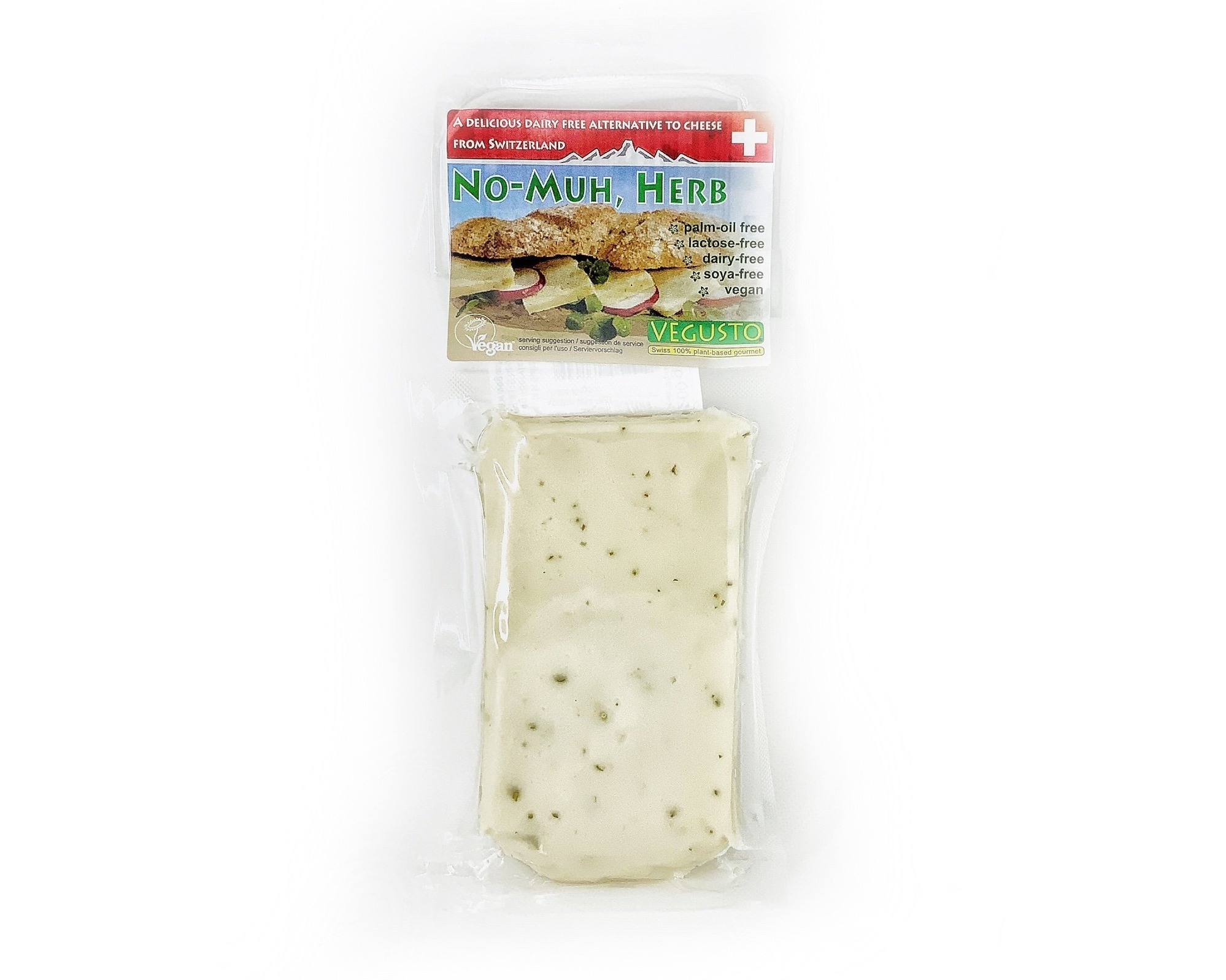 The vegan No-Moo, Herb is dairy free and therefore cholesterol free, lactose free, casein free and free of all animal-based ingredients. Vegusto’s plant-based ‘cheeses’ contain no artificial colourings, aroma or preservatives and are not tested on animals. The No-Moo range is suitable for deep-freezing except for the No-Moo, Melty.