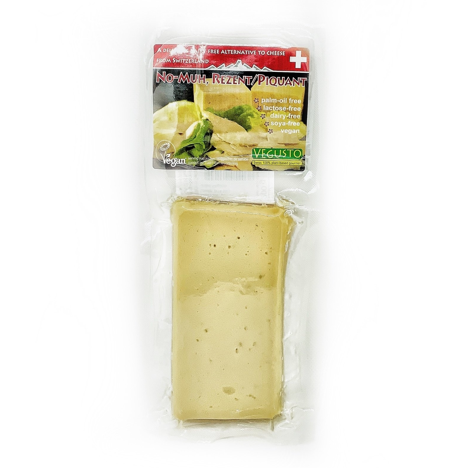 A masterpiece of piquant cheesy flavour! Its name is derived from its decidedly rich flavour; with a pronounced aroma and a piquant aftertaste. The purely plant-based No-Moo, Piquant looks and tastes like its dairy cheese rival, called Swiss Alpine cheese.