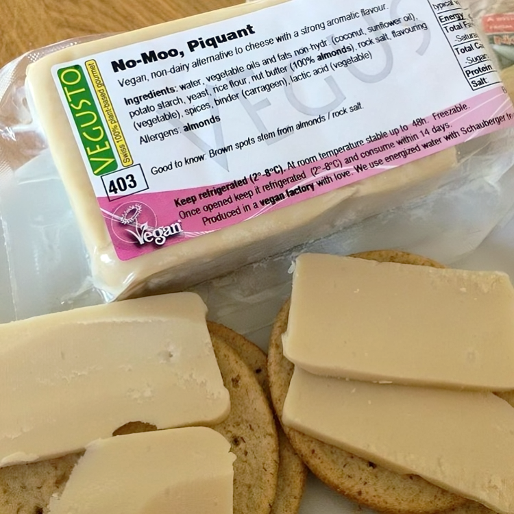 The vegan No-Moo Piquant is dairy free and therefore cholesterol free, lactose free, casein free and free of all animal-based ingredients. Vegusto’s plant-based ‘cheeses’ contain no artificial colourings, aroma or preservatives and are not tested on animals. The No-Moo range is suitable for deep-freezing except for the No-Moo Melty.