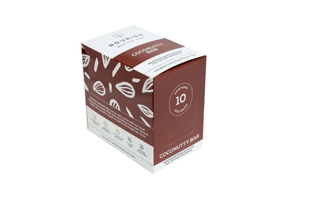 Nourish Coconutty Bars are a delightful combination with our cacao macaroons as a base, filled with nourishing nutty roast almond butter, all covered in a layer of melt in the mouth raw cacao. A healthy but super-indulgent tasting treat reminiscent of a healthy Snickers bar. These are amazing from the freezer when it's hot, hot, hot. These are Keto and Vegan Friendly. Naturally Gluten Free. Availa...