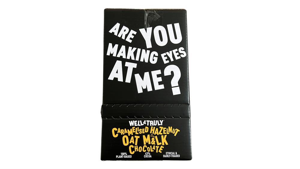 We've gone completely nuts and dialed up the crunchiness of this oat m&lk chocolate bar and smothered it with caramelised hazelnuts. This show stopping chocolate will have your taste buds screaming for an encore. Now, turn me over - you'll love the look of my bottom. So go on, tuck in! Vegan. Gluten Free. Single origin cocoa from B-Corp certified grower.