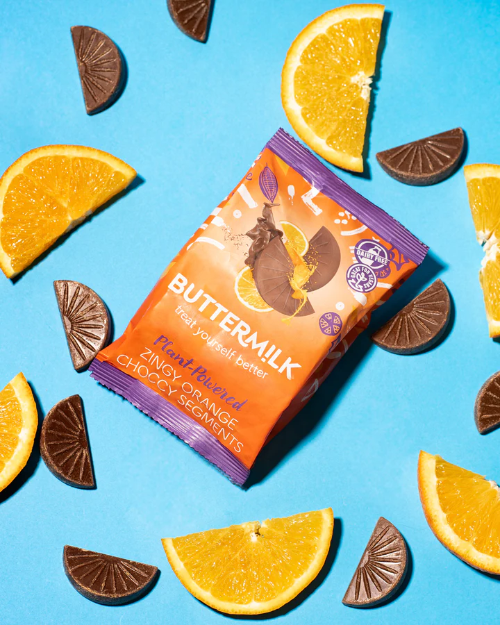 Buttermilk Plant Powered Vegan Dairy Free. Bite sized Orange Chocolate segments. Filled with zingy orange flavour, packed inside generously thick dairy free milk choccy. Yum.