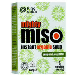 Org Miso Soup with Pumpkin & Veg 60g. King Soba Organic Mighty Miso Soup with Pumpkin and Vegetable is wheat & gluten free and delicious, convenient and nutritious. Eat Mighty Miso daily and feel great!