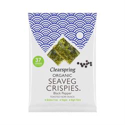 Thin and crispy toasted nori sea vegetable snack baked for just a few seconds and seasoned with natural sea salt and spicy black pepper