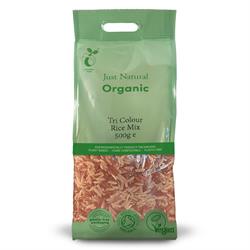 A mix of organically grown Long Grain Brown Rice, Red (Camargue) Rice and Basmati White Rice.