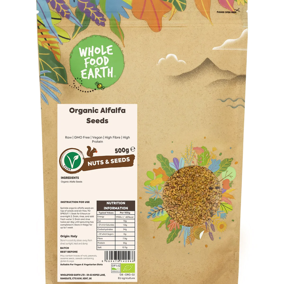 Sprinkle organic alfalfa seeds on top of salads and stir fries. TO SPROUT: 1. Soak for 8 hours or overnight 2. Drain, rinse, and add fresh water 3. Drain and rinse twice per day until sprouting has completed 4. Store in fridge for up to 1 week
