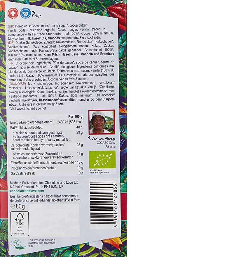 This pleasingly high-percentage chocolate is full bodied yet mild, decadent and incredibly smooth with hints of nuts and an extraordinary chocolate flavour, ideal for the chocolate purist. We challenge you to find a smoother, less bitter, 80% chocolate bar.