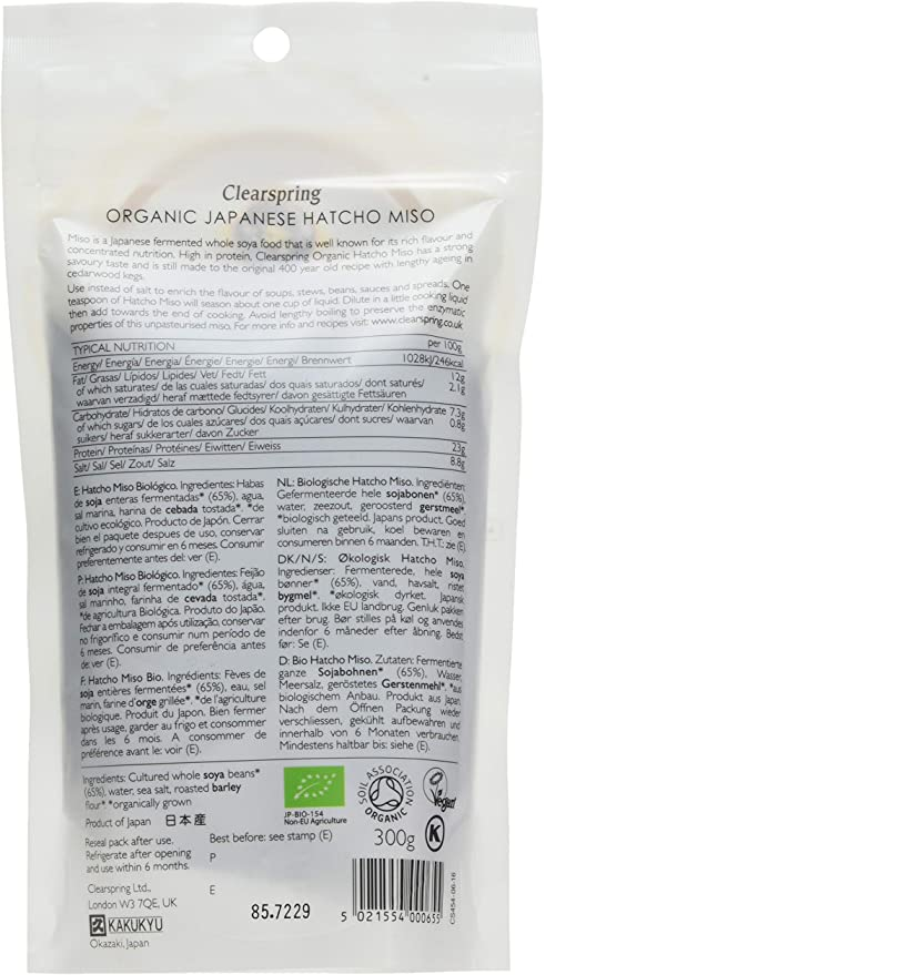 During the 18 years Clearspring's founder Christopher Dawson lived in Japan he became an expert on miso quality, and the Clearspring range is his selection of the finest traditionally made Japanese miso. All traditionally fermented Japanese miso is prepared by cooking the finest organically grown ingredients (whole soya beans and cereal grains) and combining them with a koji culture (grains or soya beans inoculated with Aspergillus oryzae mould spores) sea salt and water. Then naturally aged in cedarwood kegs over many months at ambient temperature the enzymes from the koji, along with naturally occurring yeasts and bacteria, gradually break down the complex grains and beans into readily digestible amino acids, fatty acids and simple sugars. The resulting miso has rich and complex flavours and an abundance of umami, the fifth taste.