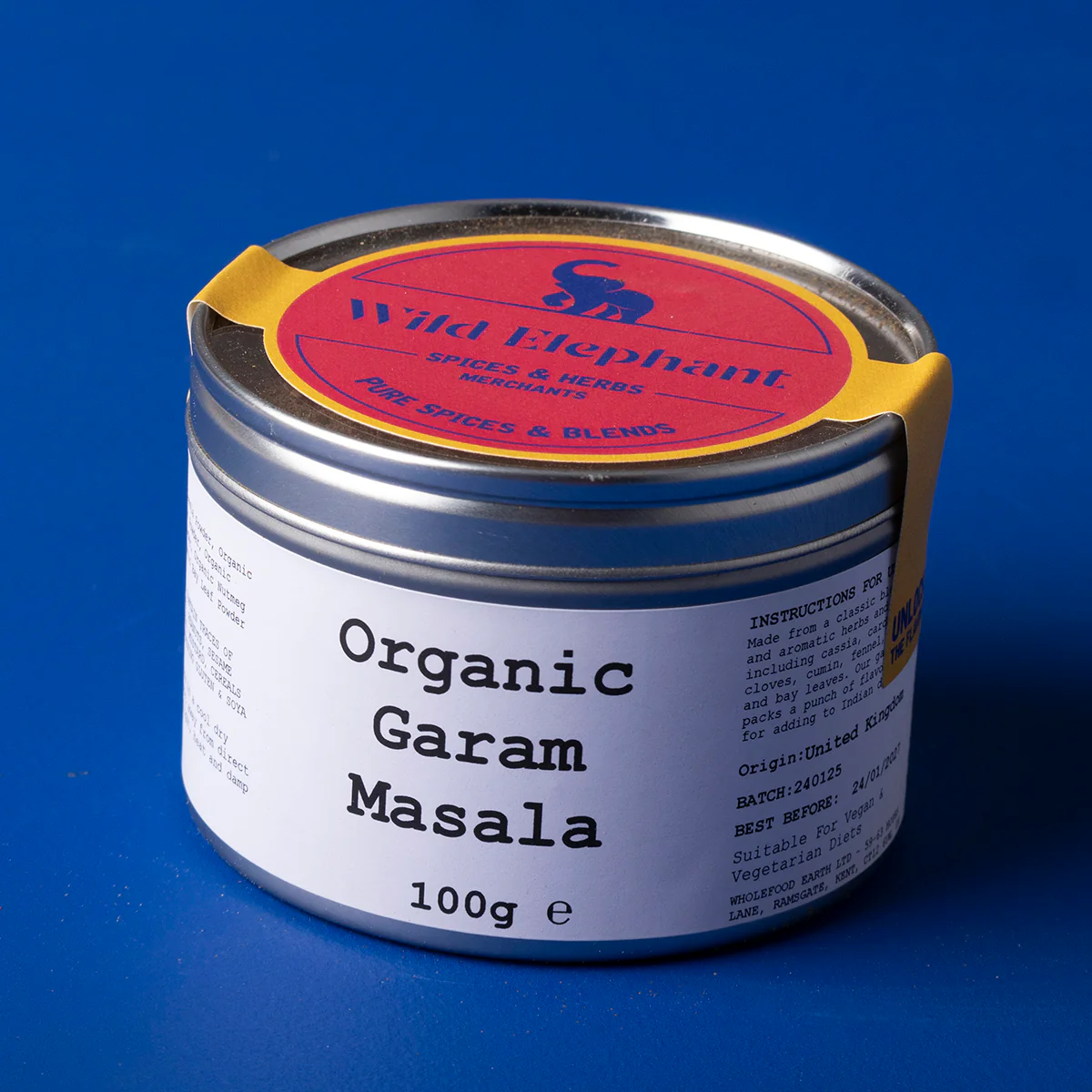 Wild Elephant Organic Garam Masala have a unique strong warming flavour due to combination of sweet and savoury spices including cassia, cardamom, nutmeg cloves, cumin, fennel, coriander, and bay leaves,