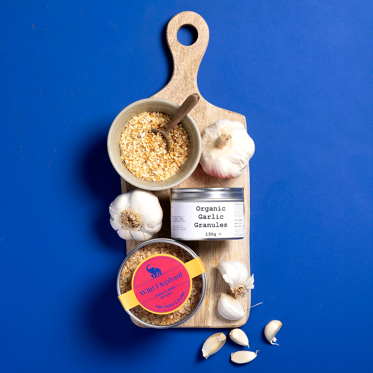 Our Wild Elephant garlic granules are made by drying and crushing fresh organic garlic cloves. Dried garlic is more concentrated, longer-lasting, and easier to use than its fresh counterpart.
