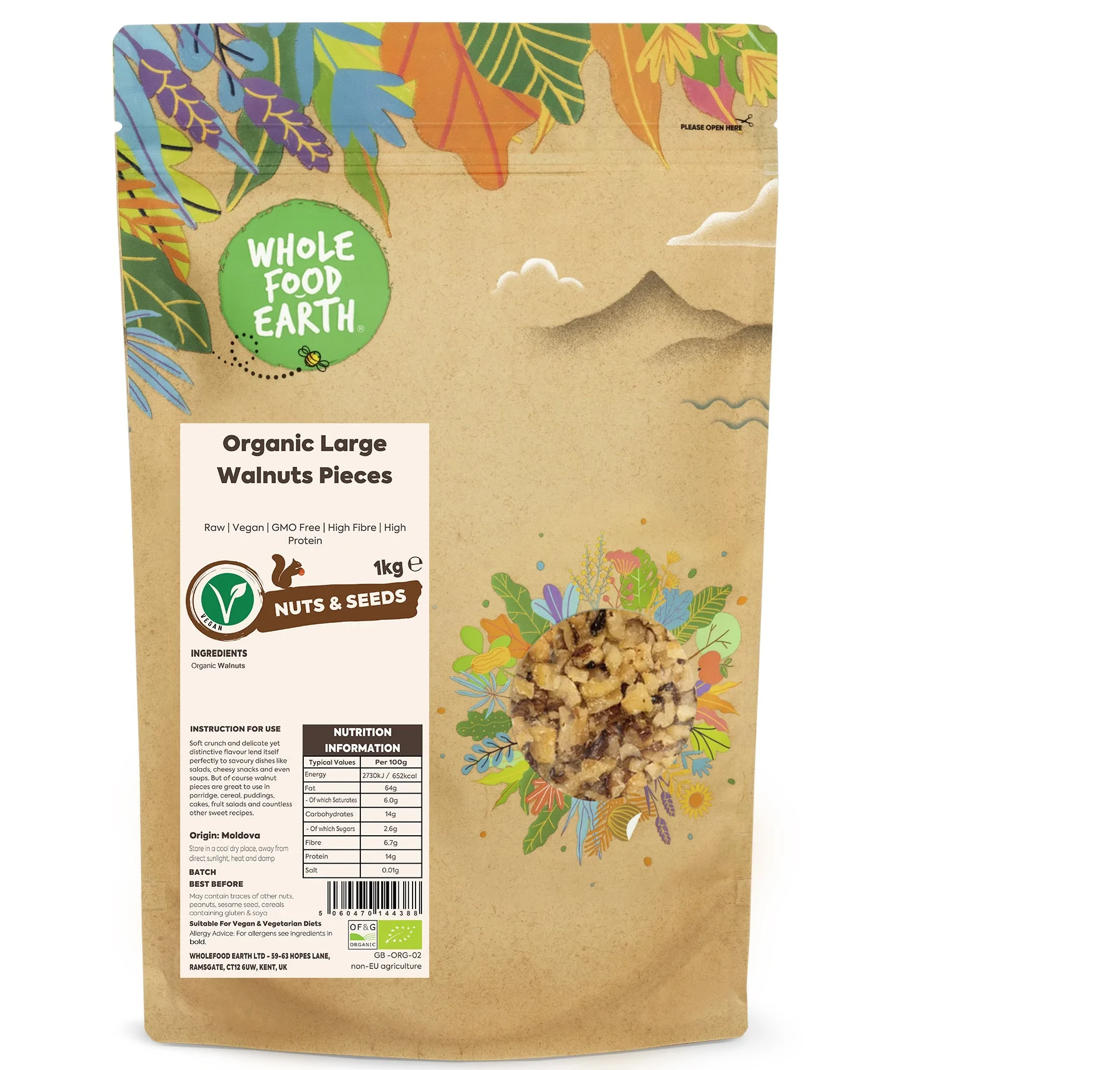 Unlike many, our walnuts come with the skin on as it has been found to contain 90% of the phenols, including key phenolic acids, tannins, and flavonoids. The flaky, waxy skin can be slightly bitter to taste which is why many recipes call for this to be removed however It is recommended eating with the skin for maximum walnut goodness.