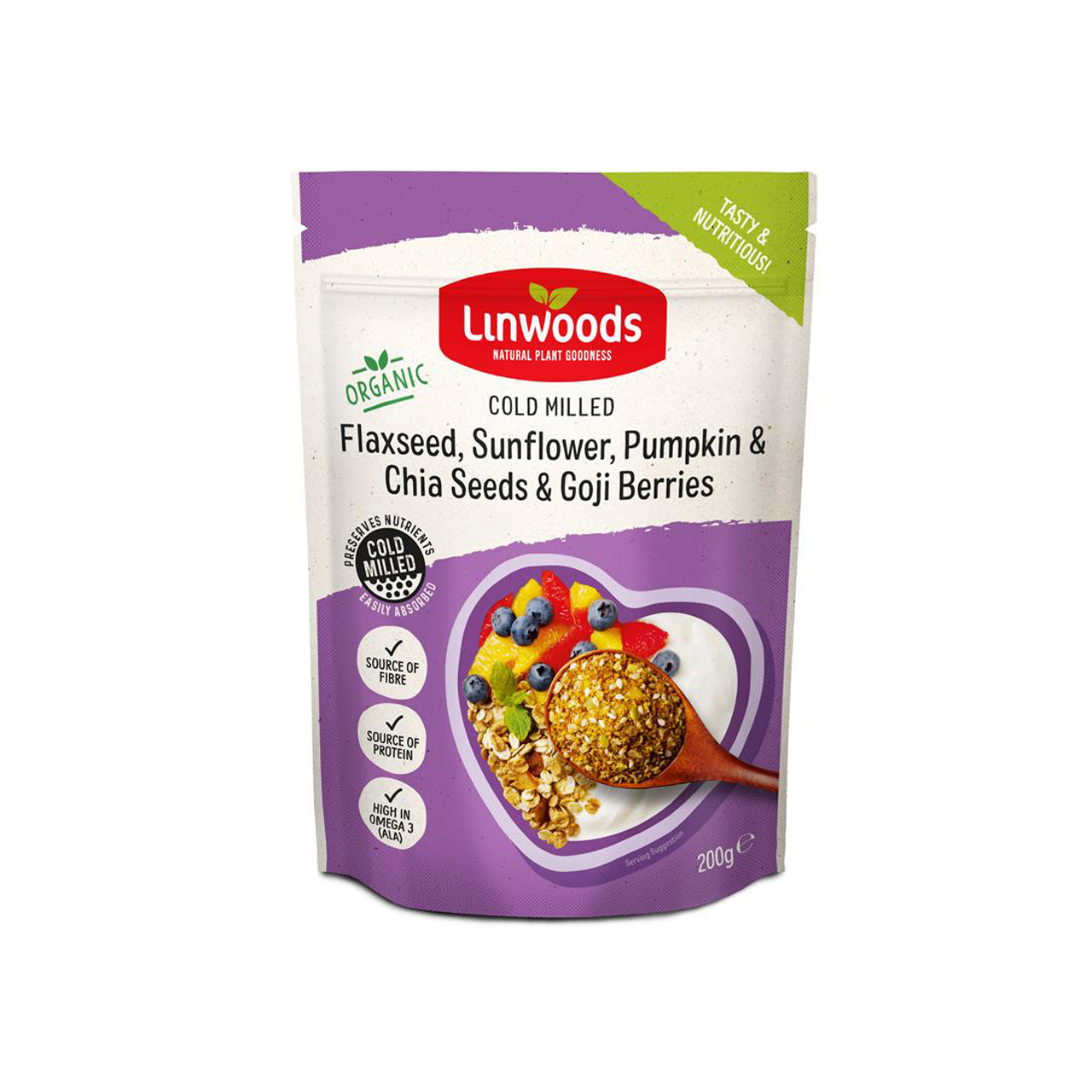 Expertly crafted, a nutritionally rich blend of Organic Milled Flaxseed Sunflower Pumpkin Chia & Goji by Linwoods.