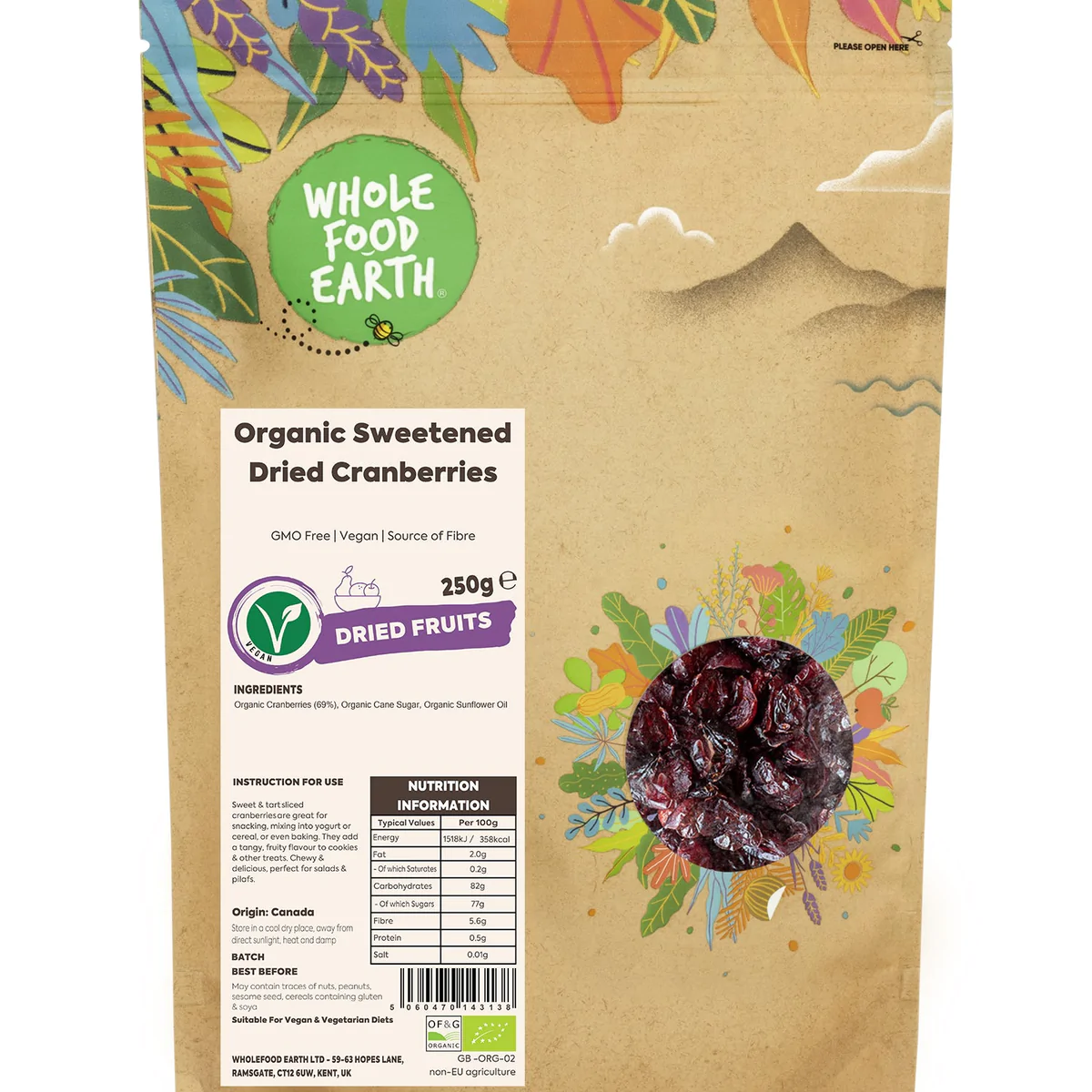 Dried cranberries are sweeter than fresh cranberries and can double for raisins in some recipes, ours have a little organic raw unrefined cane sugar added as cranberries are quite bitter/sour without it, in any case is certainly doesn’t interfere with the delicious tangy flavour, us cranberry fanatics crave! Equally so we still get all the healthy benefits that come with Cranberries too!