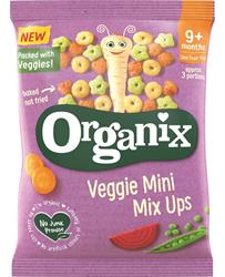 NEW Organix Veggie Mini Mix Ups are organic corn & rice puff shapes with delicious peas, parsnips, carrot and beetroot. They make the perfect baby finger food and toddler snack. Our fun and colourful mixed corn & rice shapes are gently baked with mixed vegetables, and perfectly sized for little fingers. Suitable for 9+ months. I'm organic. Gluten free. Baked not fried. No added salt or sugar. N...